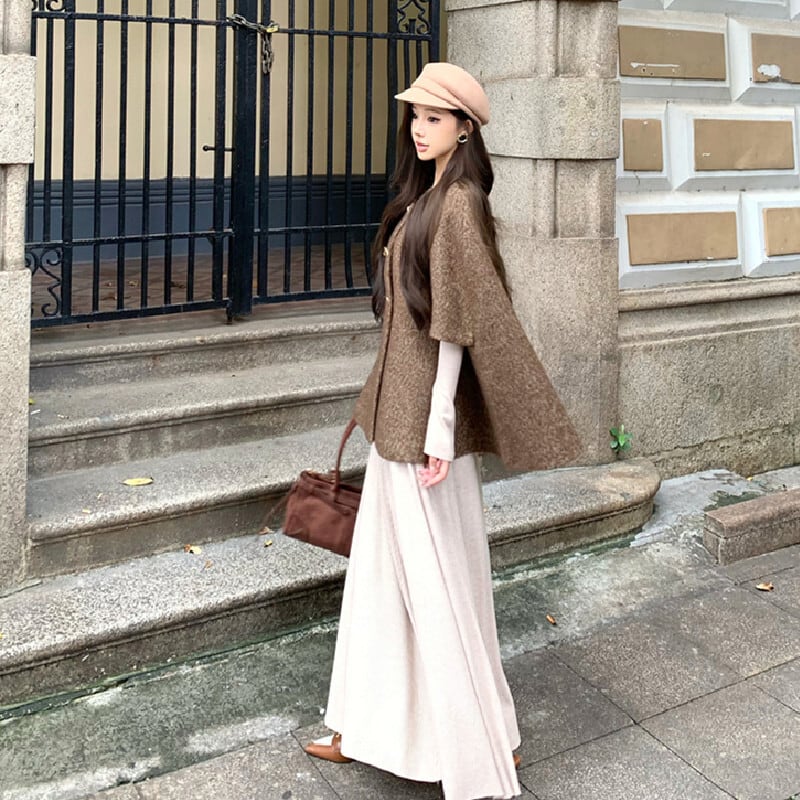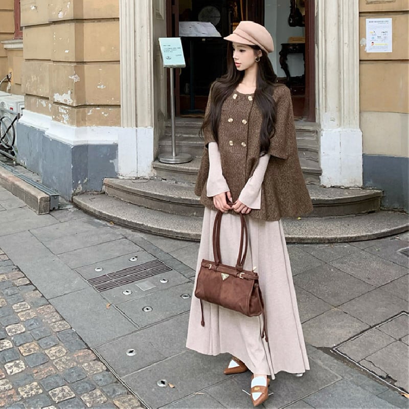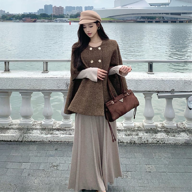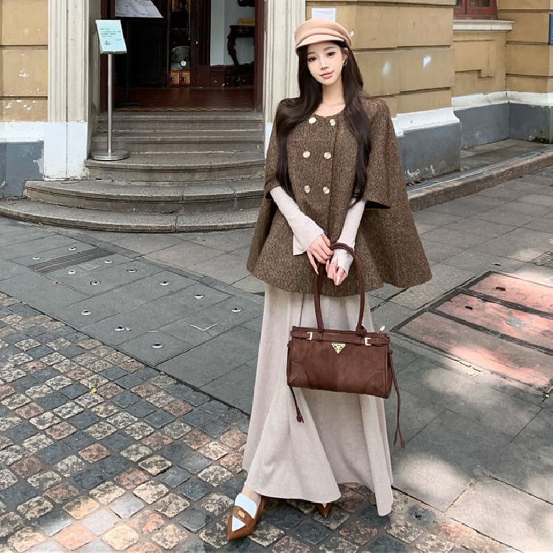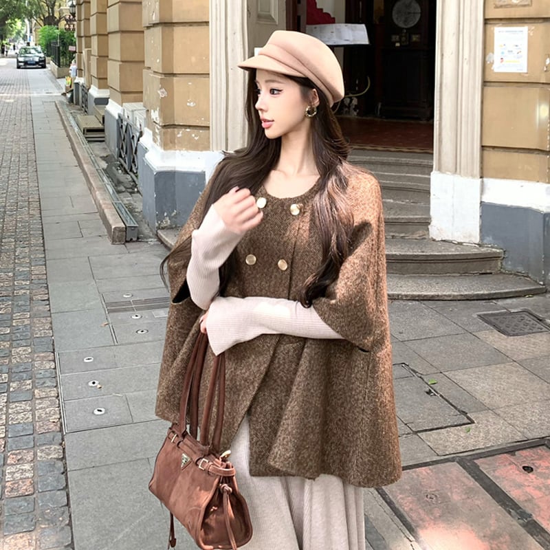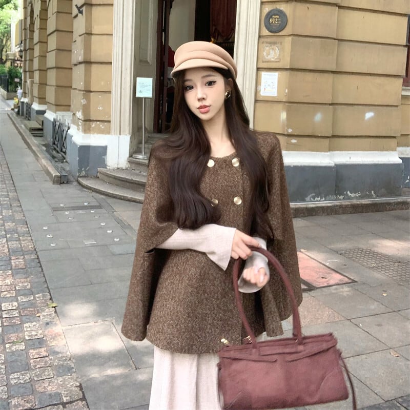 アウター ケープ風ポンチョコート ダブルブレスト レトロ コーヒー色 S M L