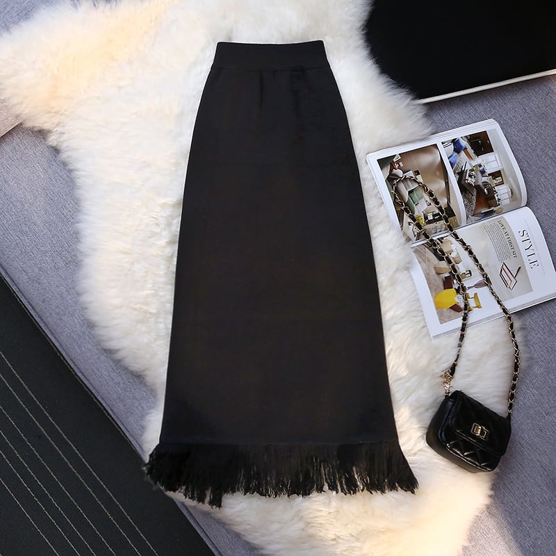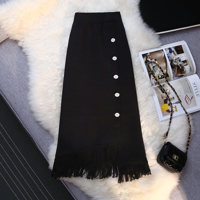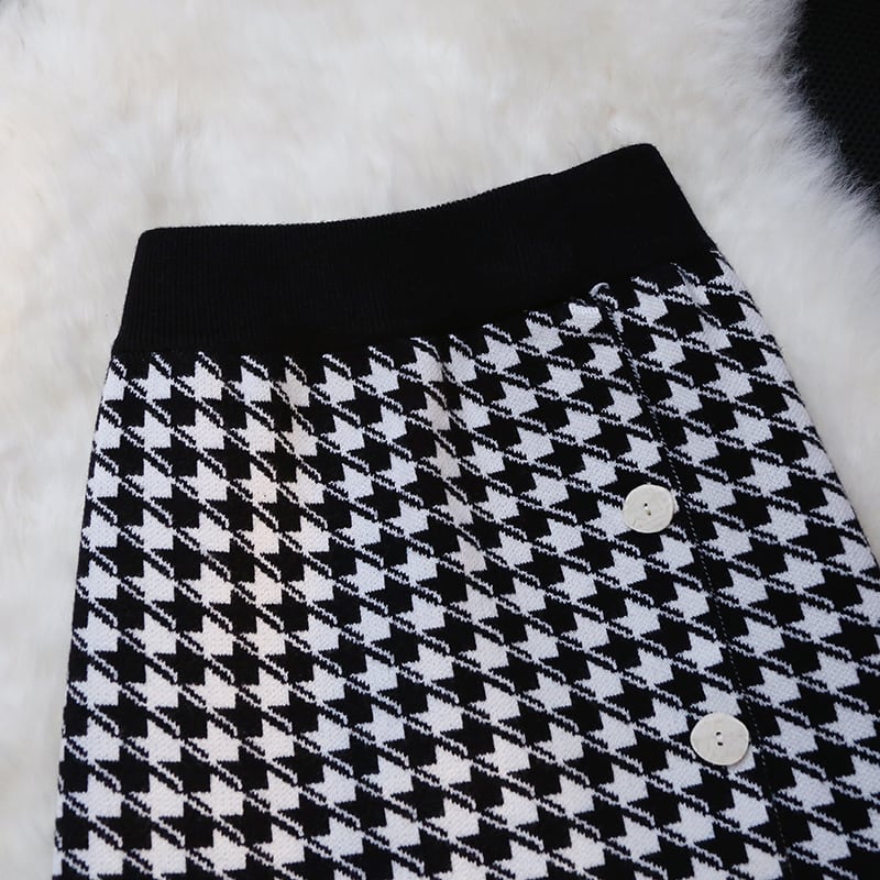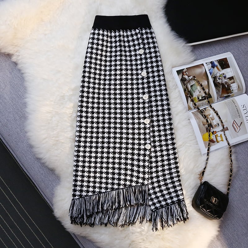 ボトムス スカート 千鳥格子柄 ニット 不規則 ハイウエスト ブラック S M L XL