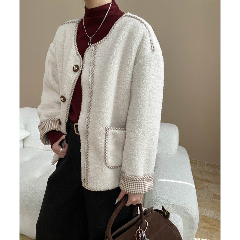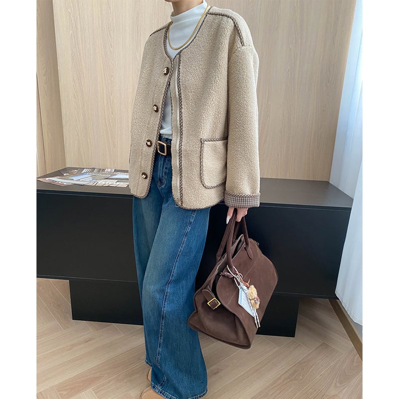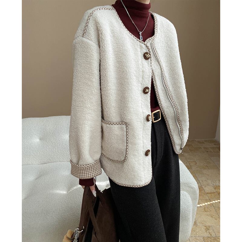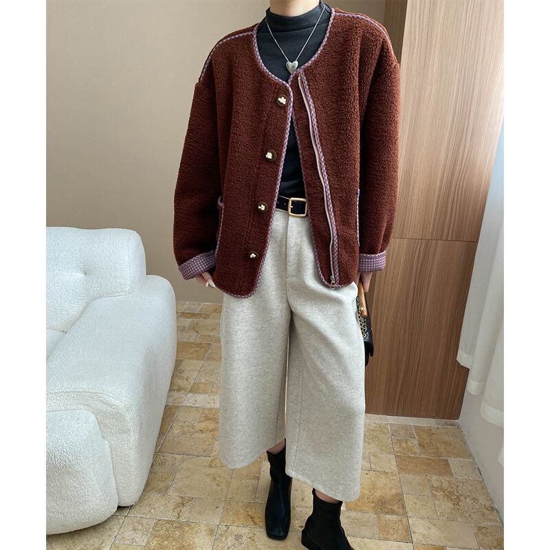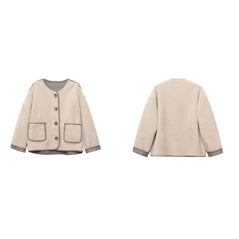 4色展開 モケット アウター ラウンドネック チェック柄 シングルブレスト