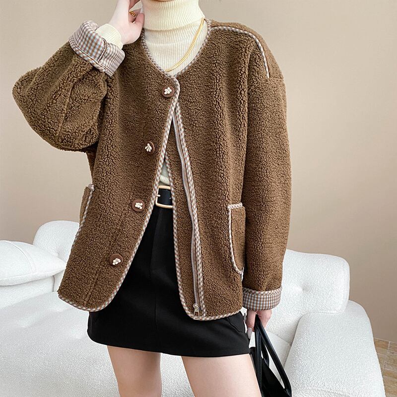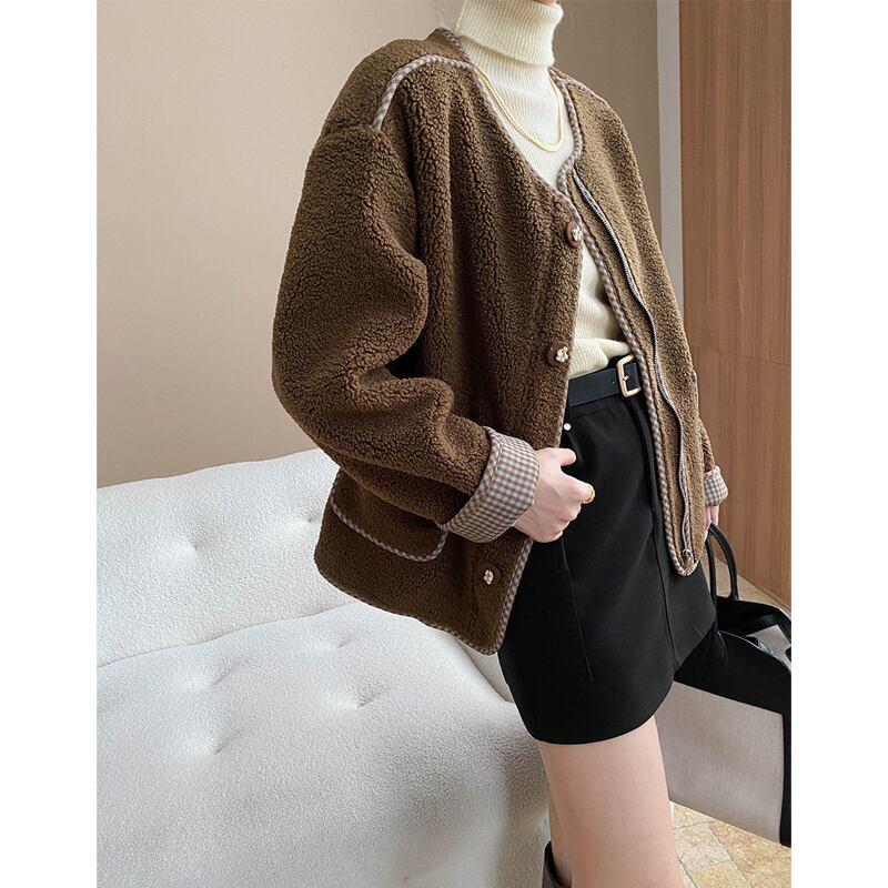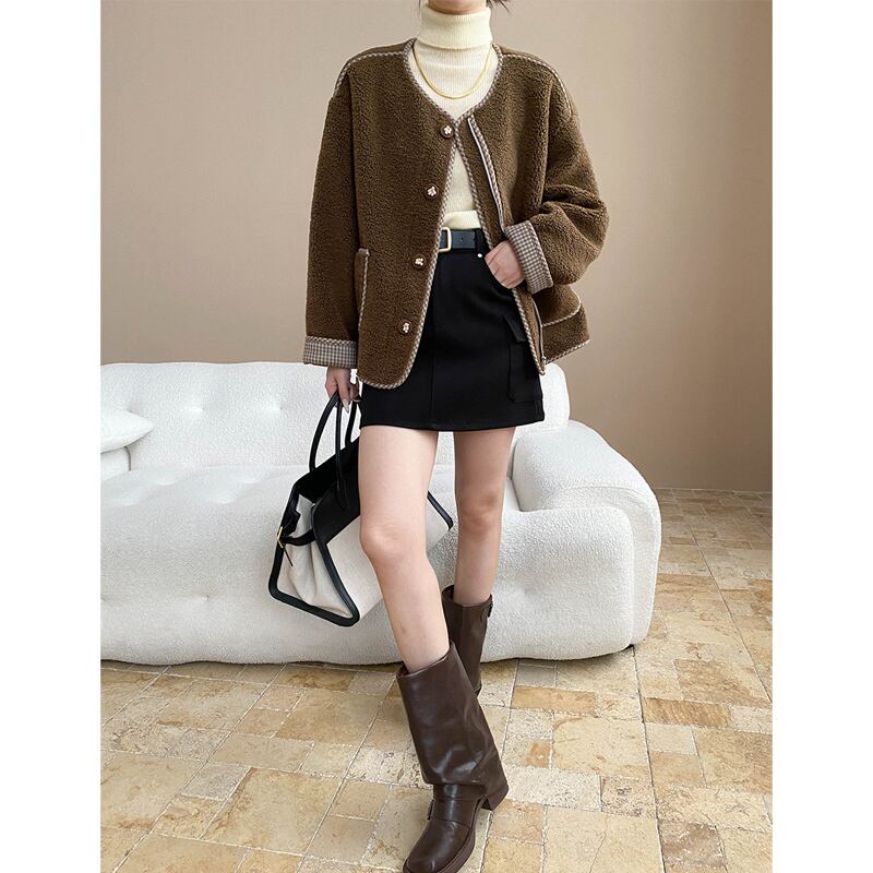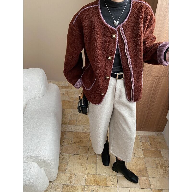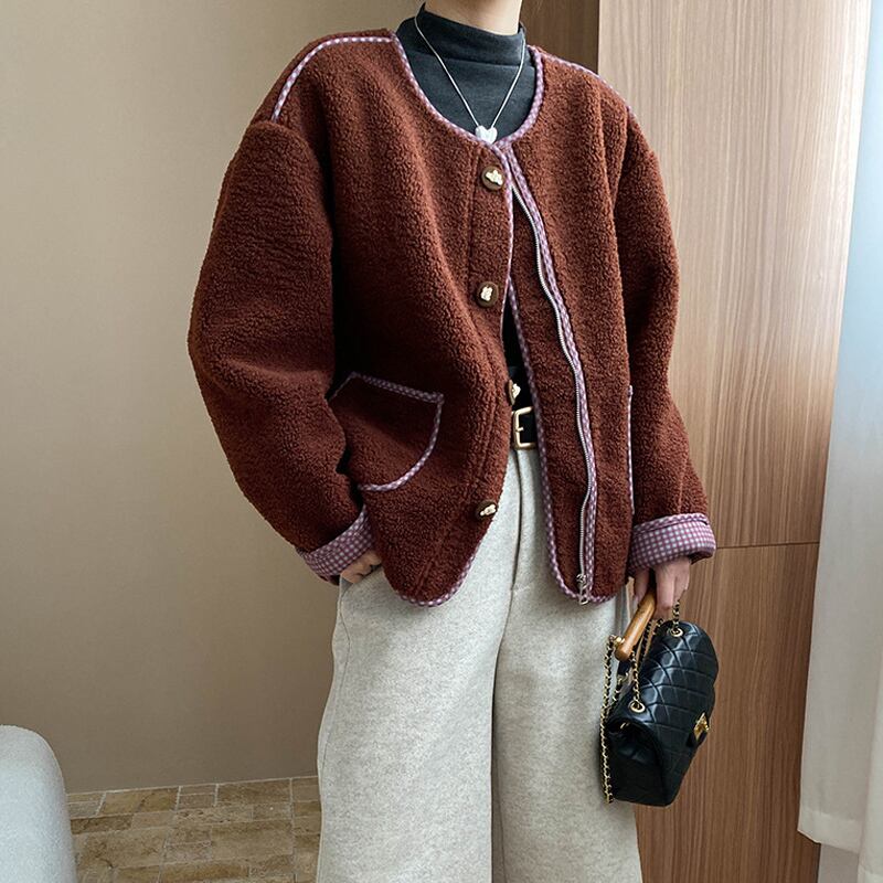 4色展開 モケット アウター ラウンドネック チェック柄 シングルブレスト