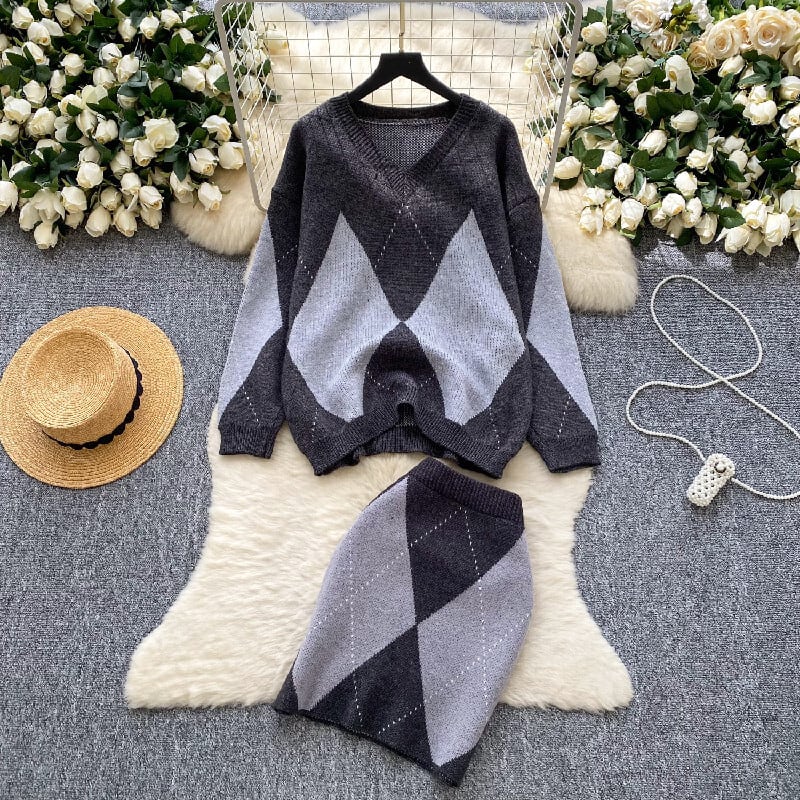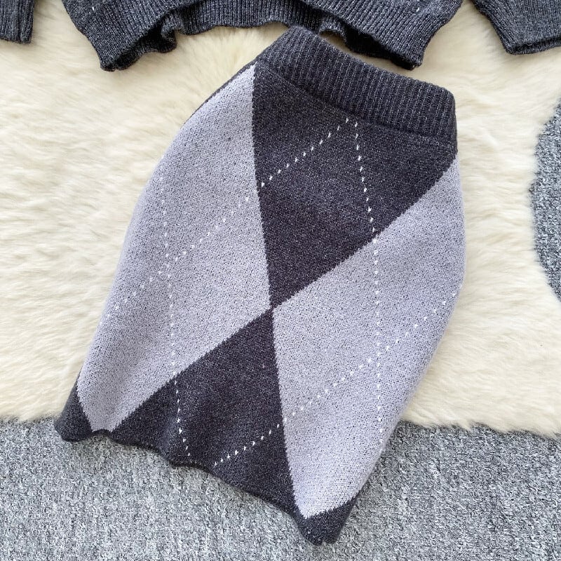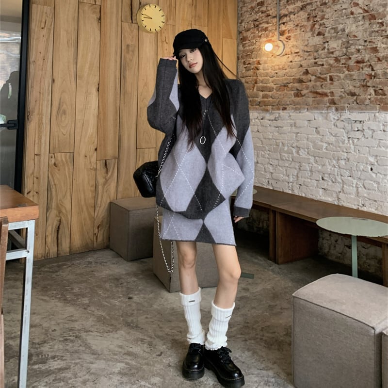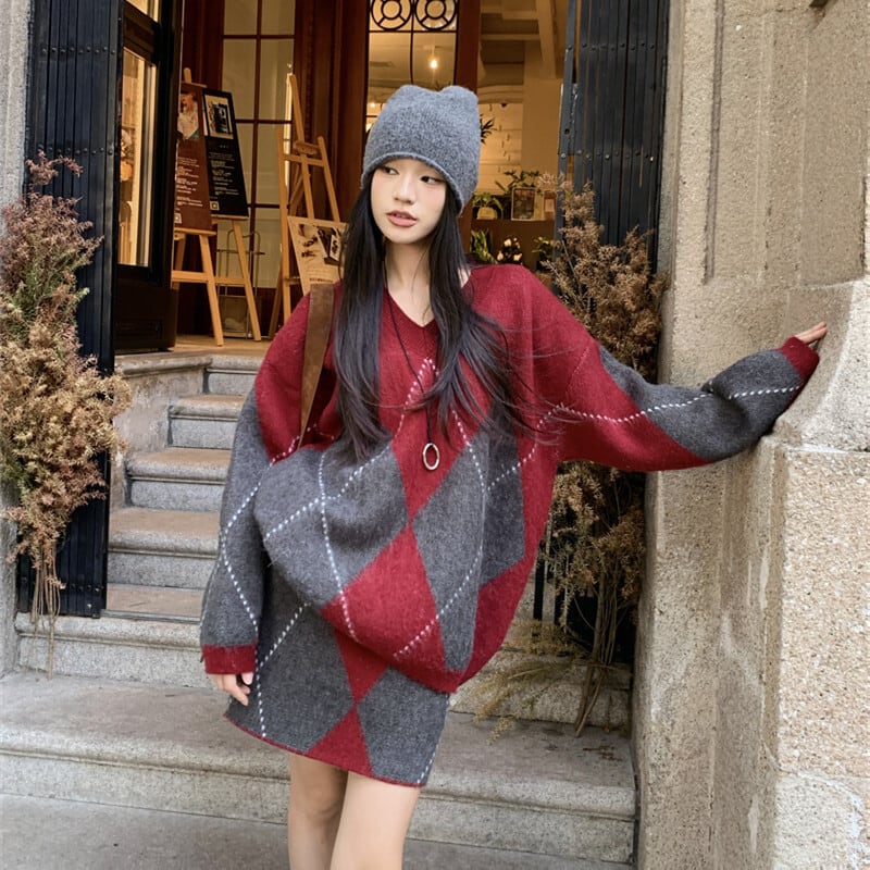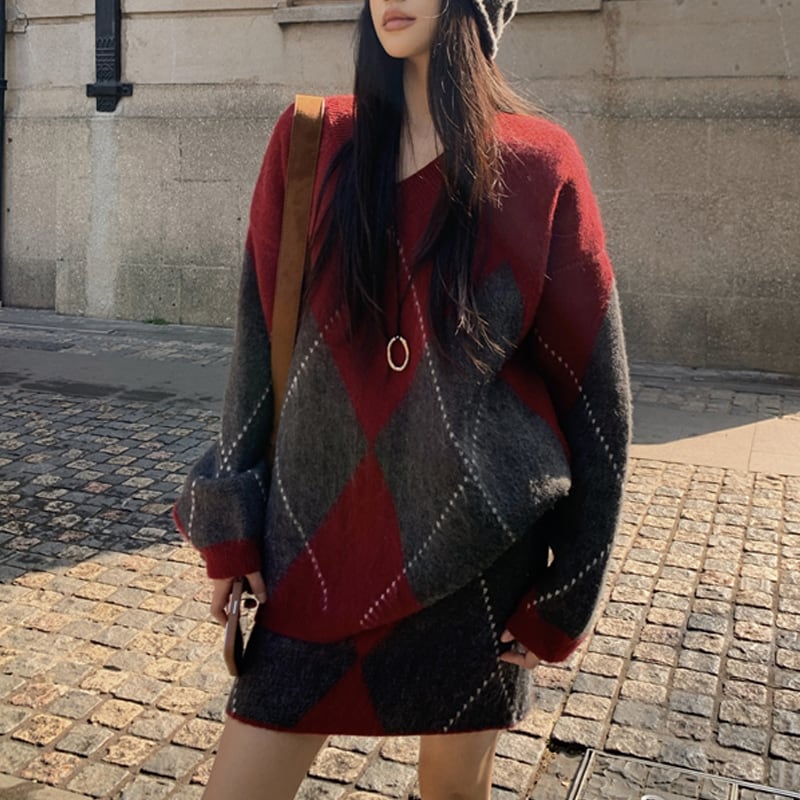 セットアップ トップス+スカートゆったり ニット ダイヤモンドパターン 着回しコーデ レッド グレー