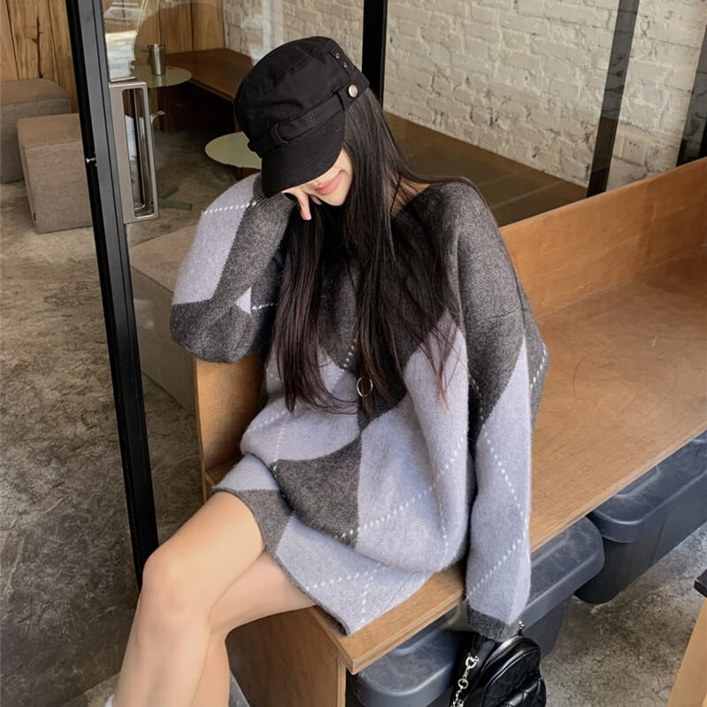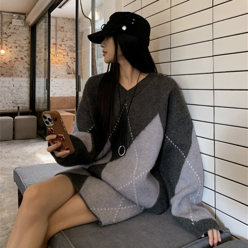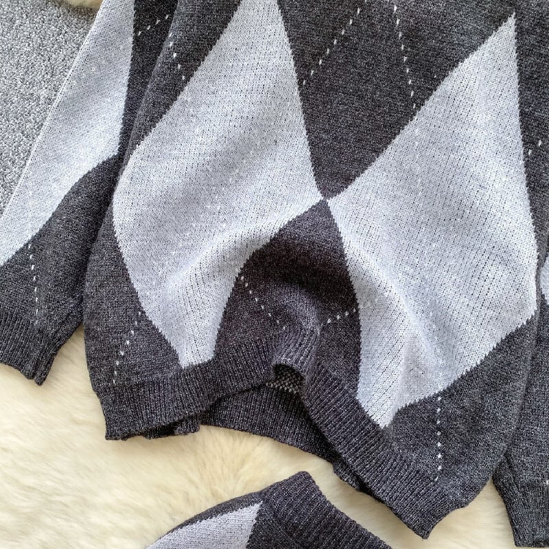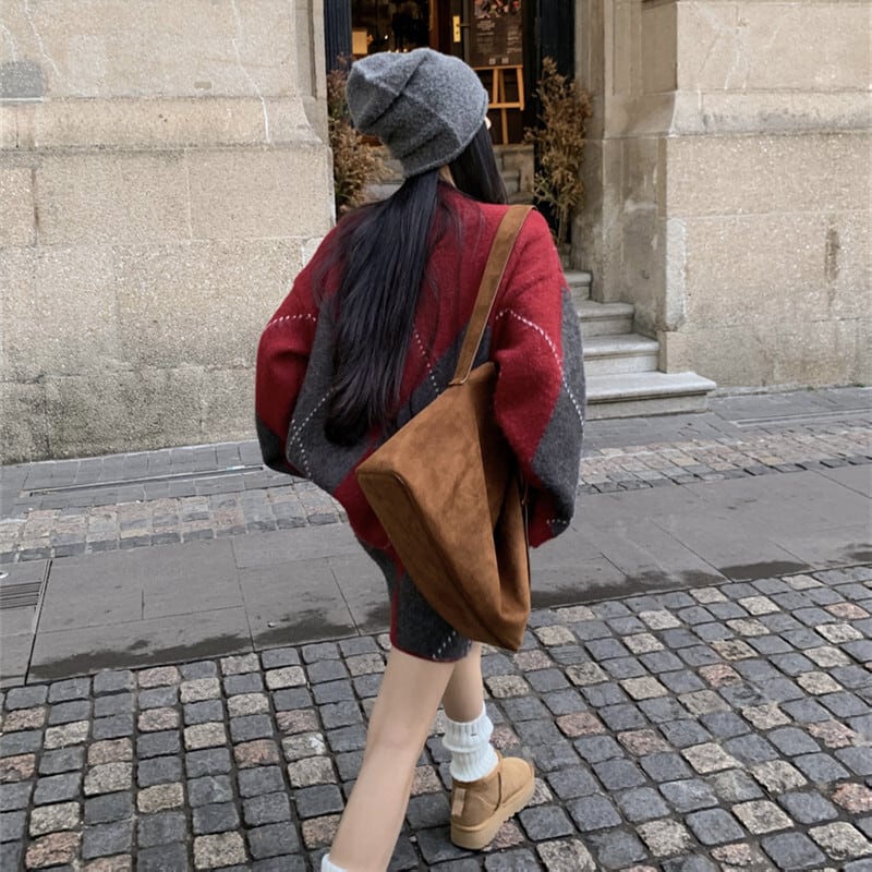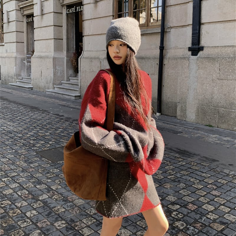 セットアップ トップス+スカートゆったり ニット ダイヤモンドパターン 着回しコーデ レッド グレー