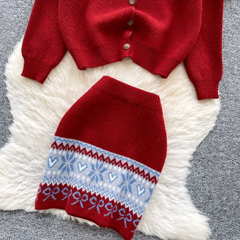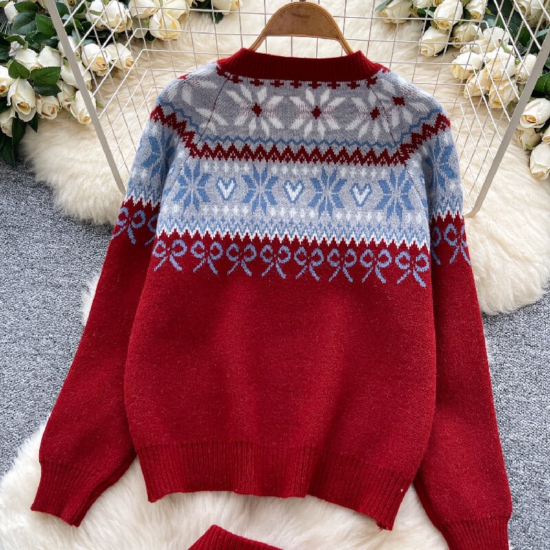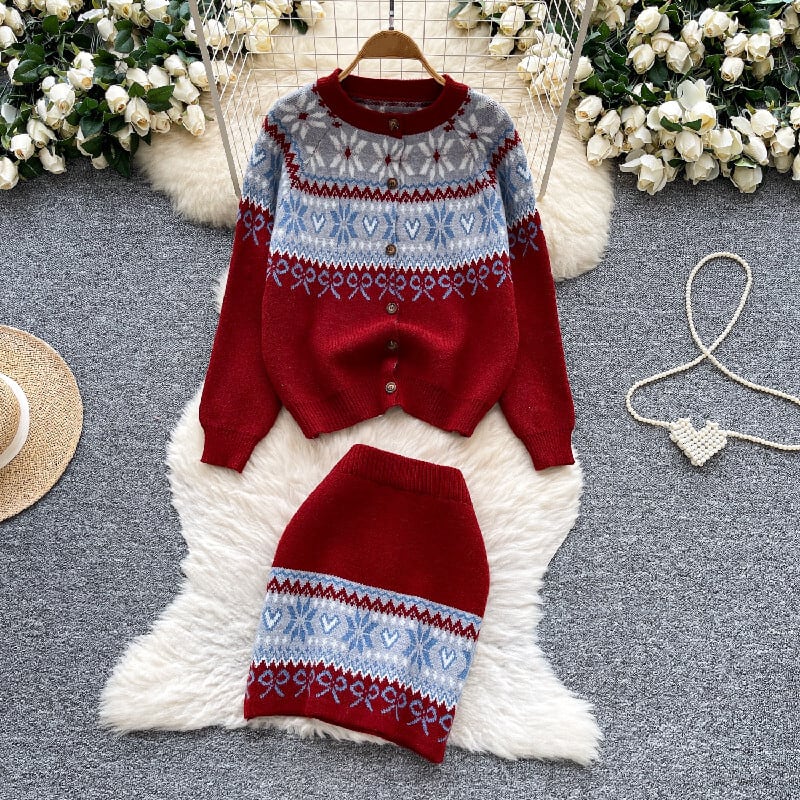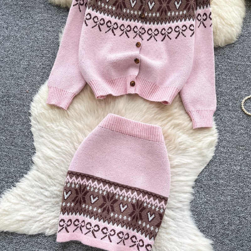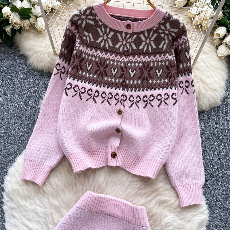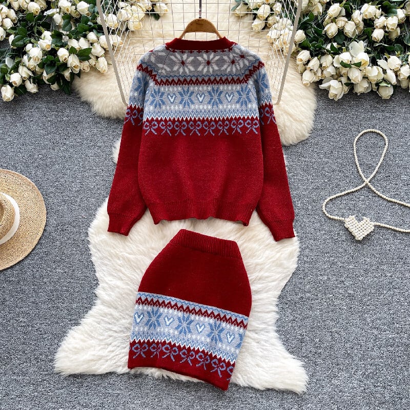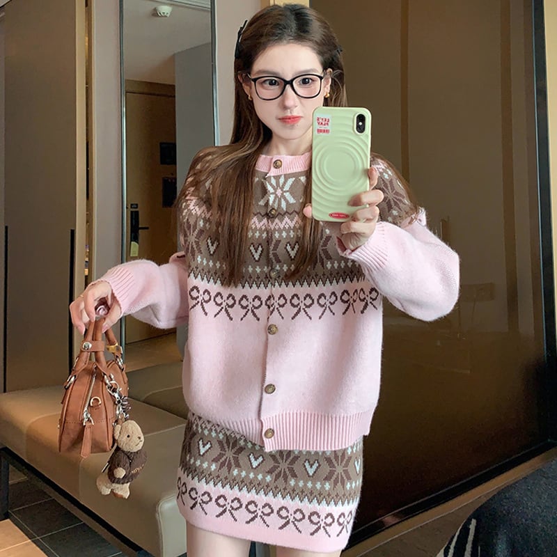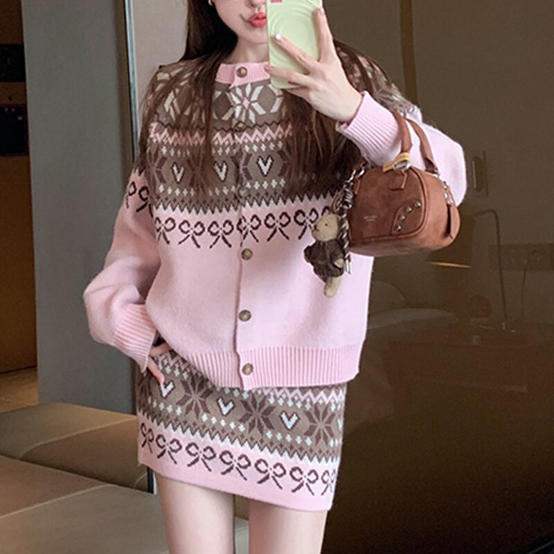 セットアップ トップス+スカート ニット 配色 ボヘミアン ピンク レッド