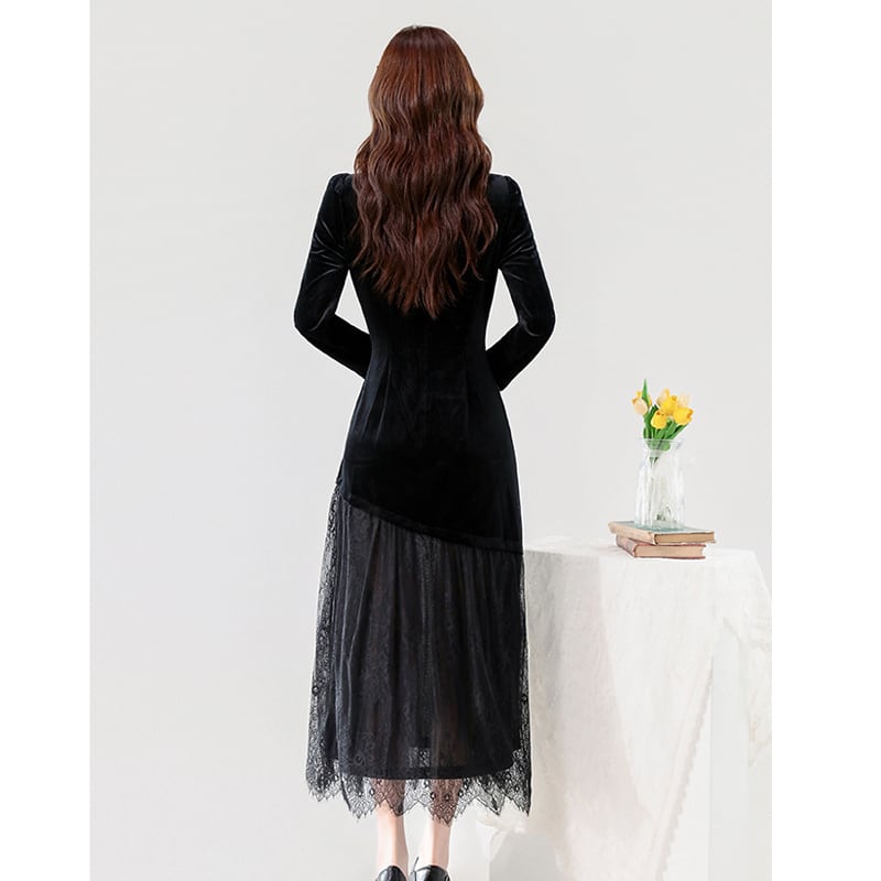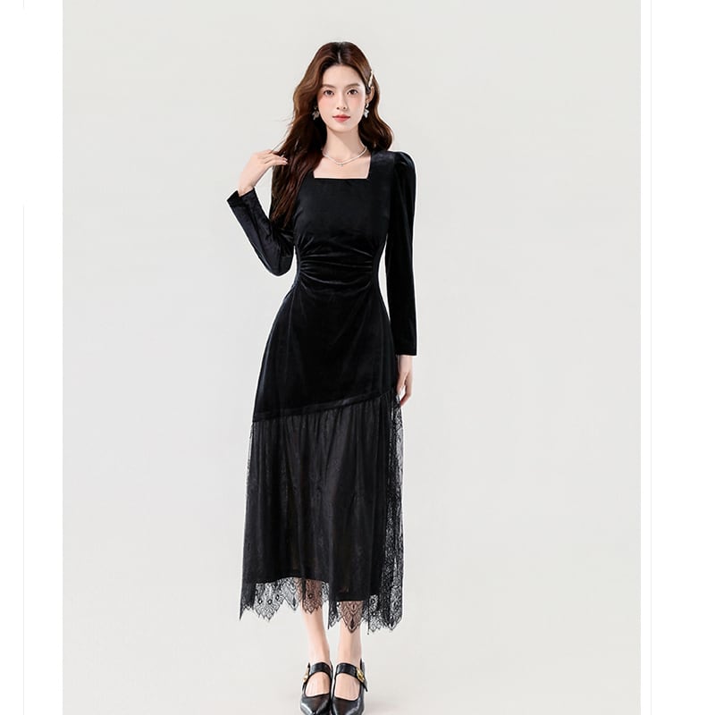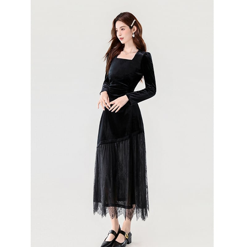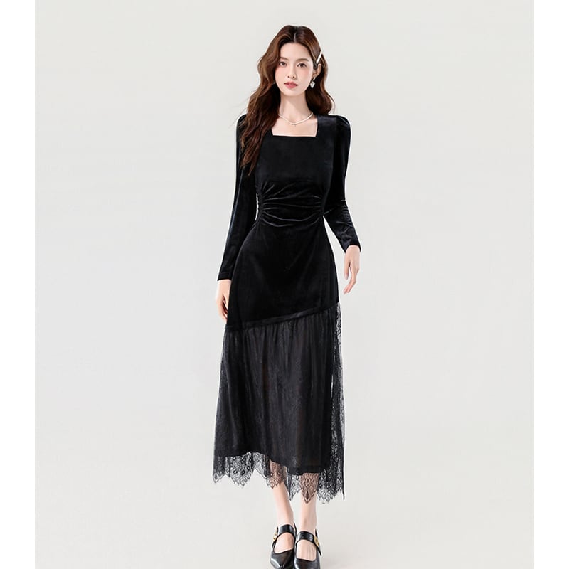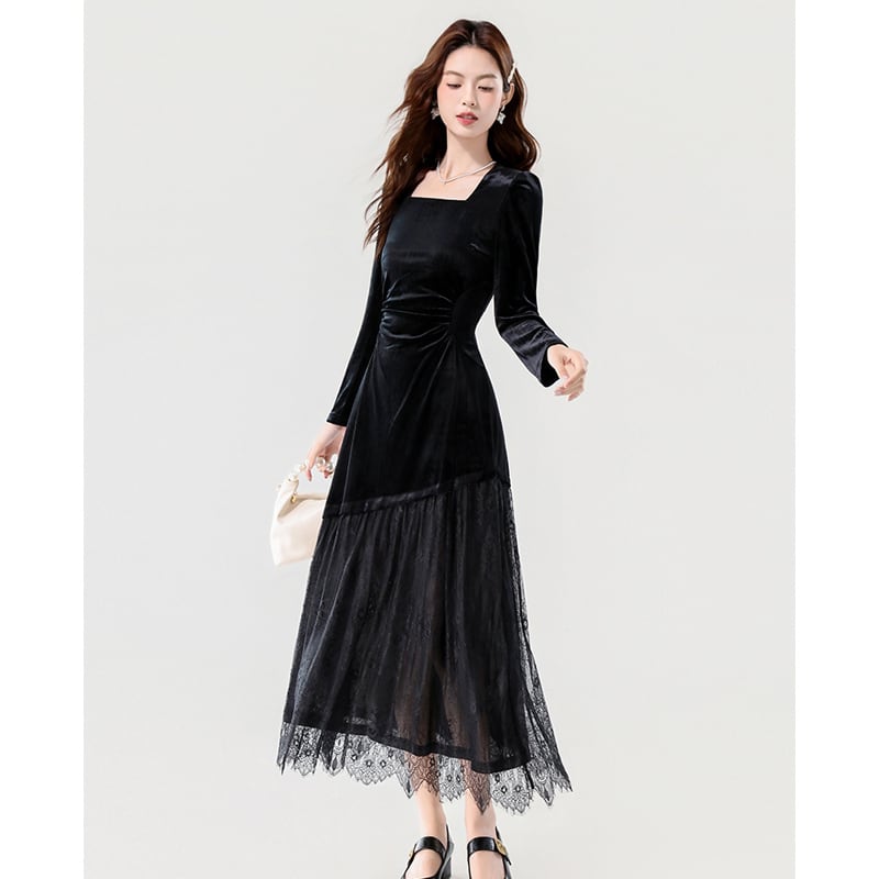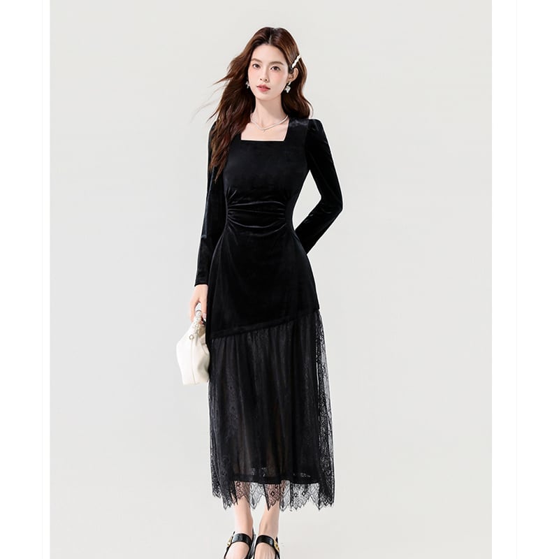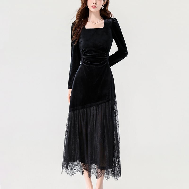 ワンピース スクエアネック ベルベット フィットウエスト レース ブラック S M L XL