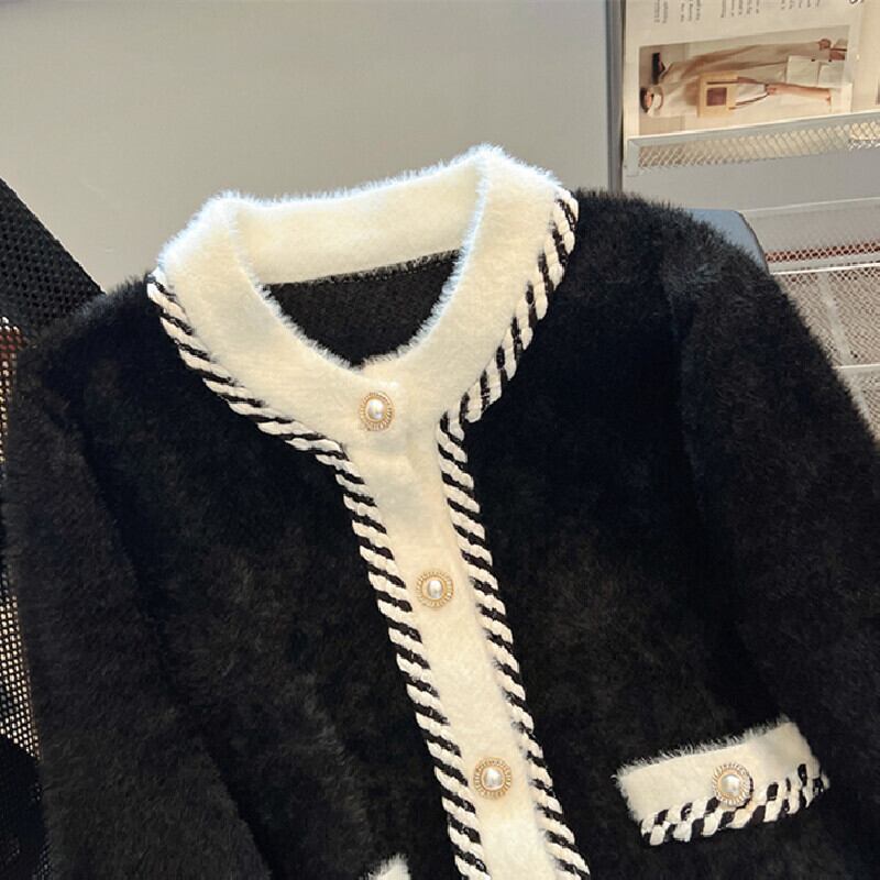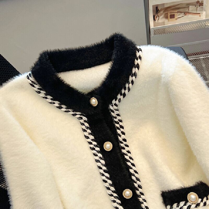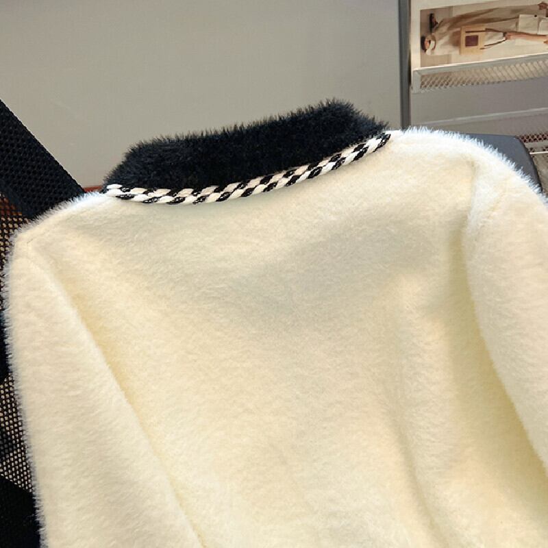 トップス セーター ミンク風 長袖 配色 エレガント ベージュ ブラック