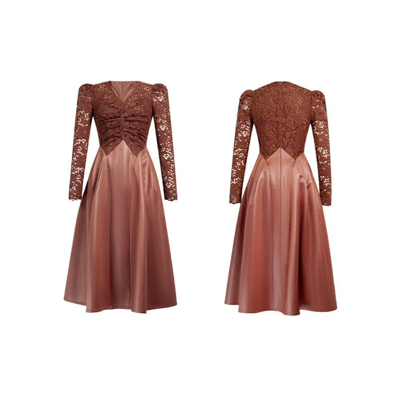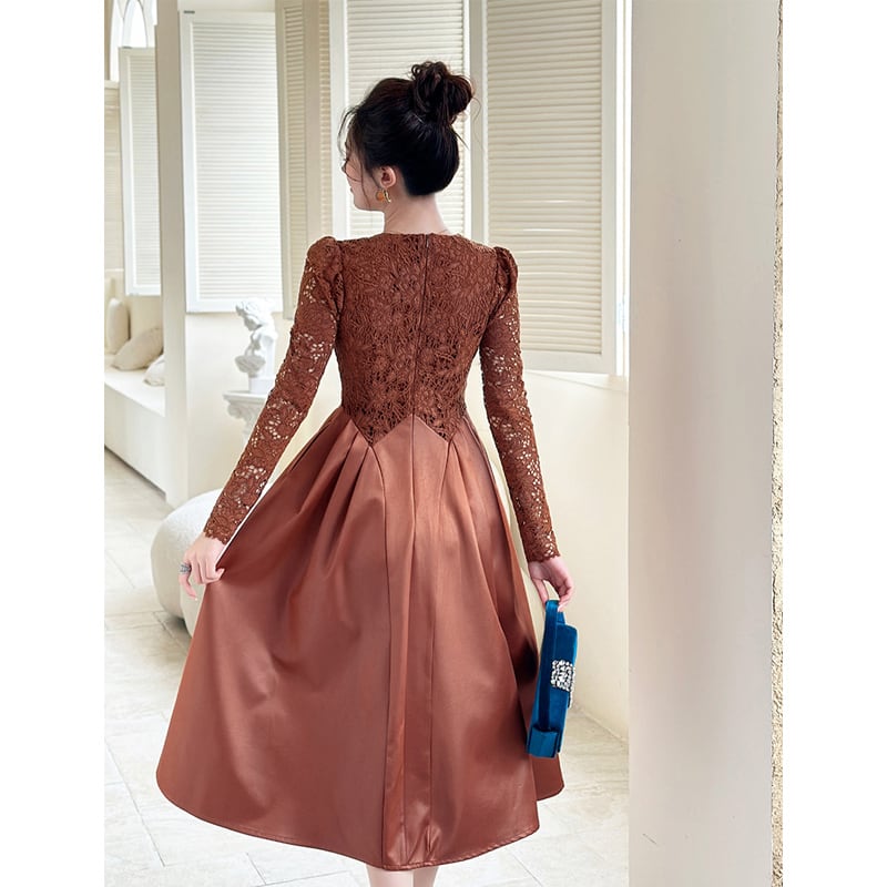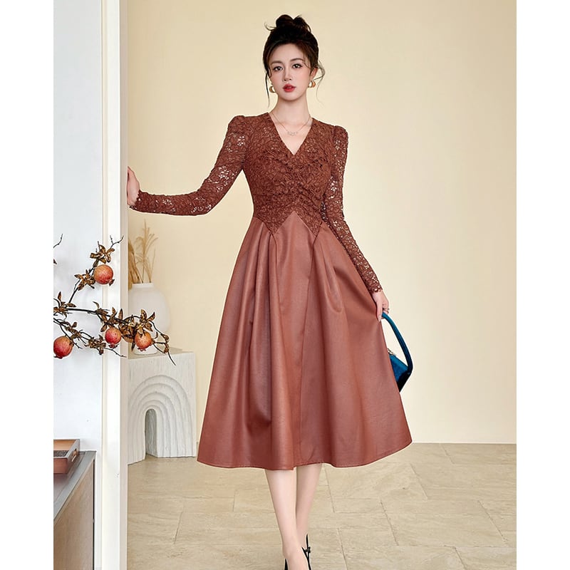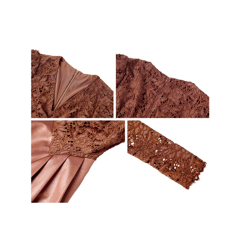 【夕暮薔薇シリーズ】レース Vネック くびれシルエット キャラメル色 ワンピース
