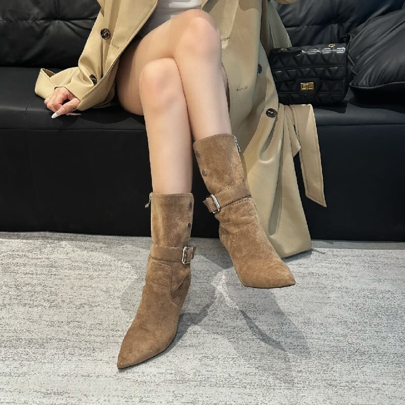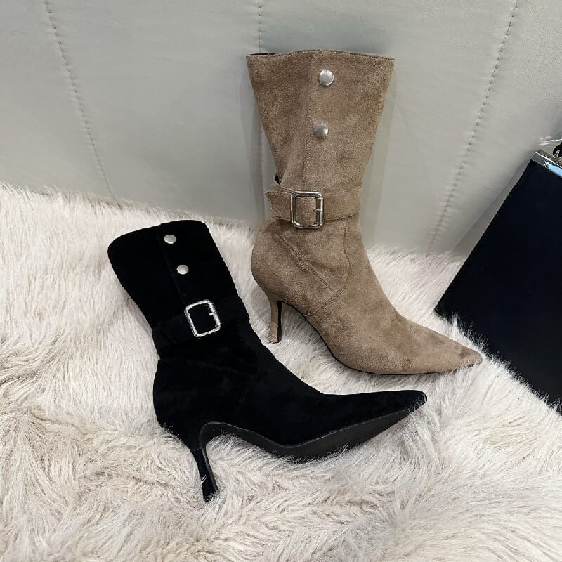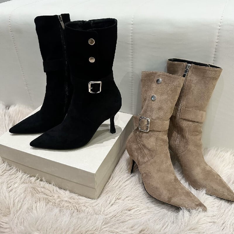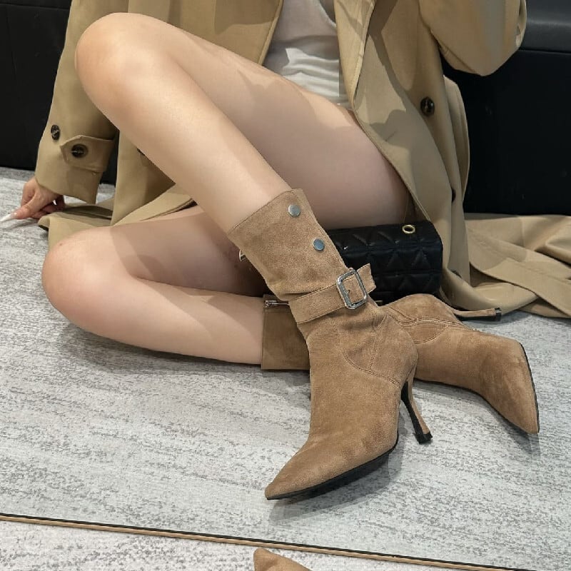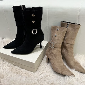 レトロ スエード スタイリッシュ ショートブーツ ブラック ライトブラウン 8CM