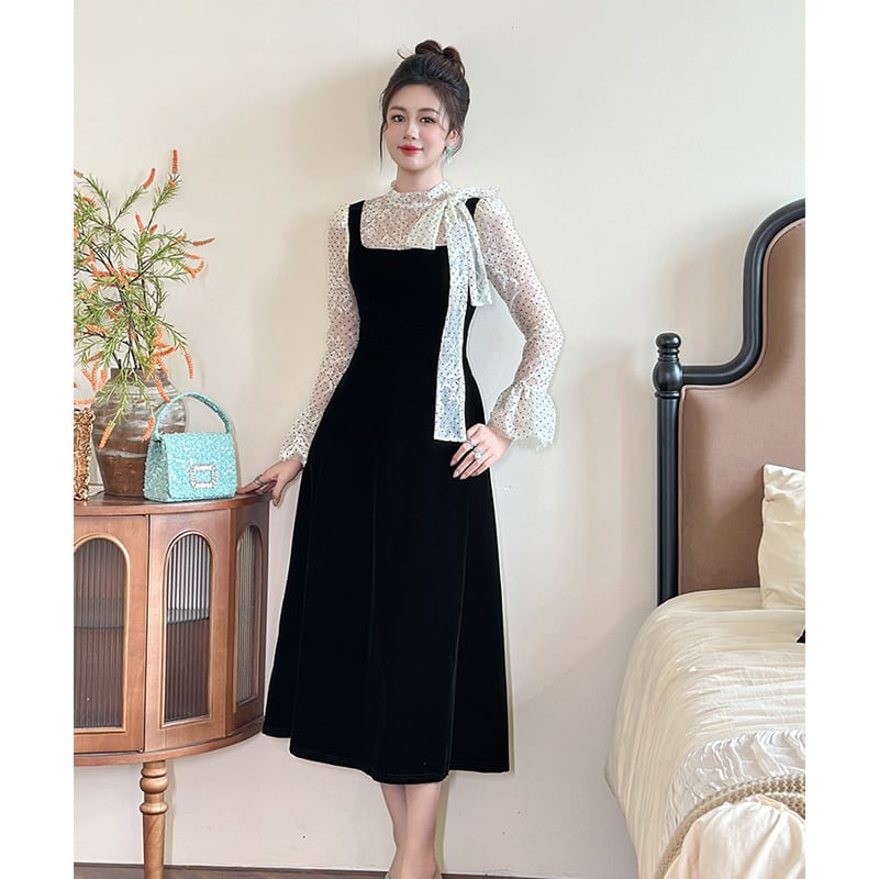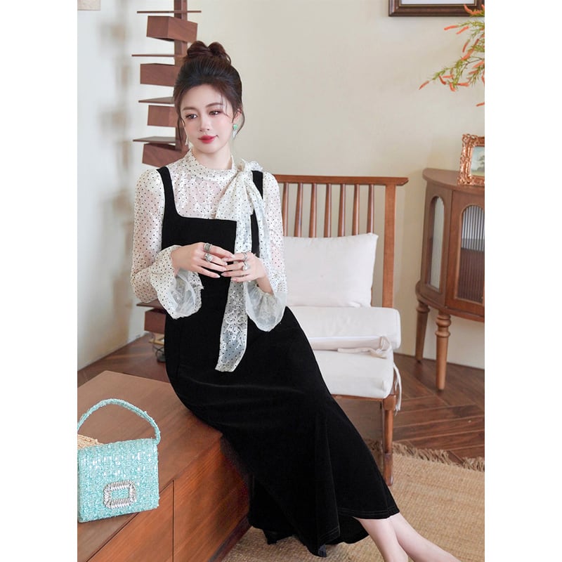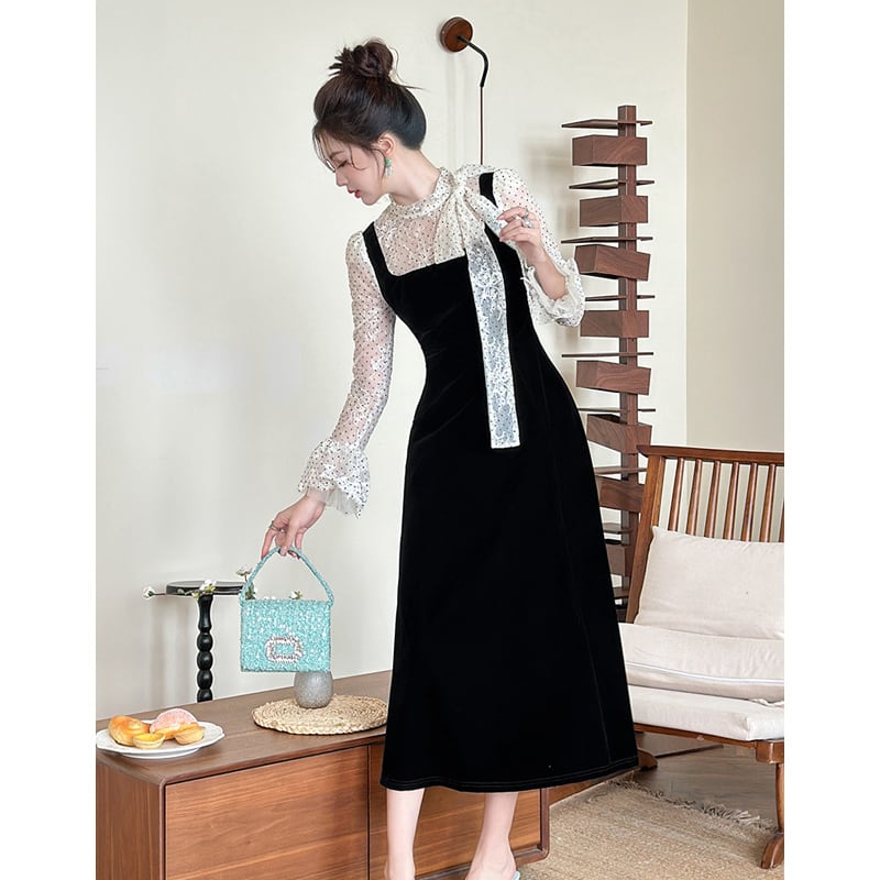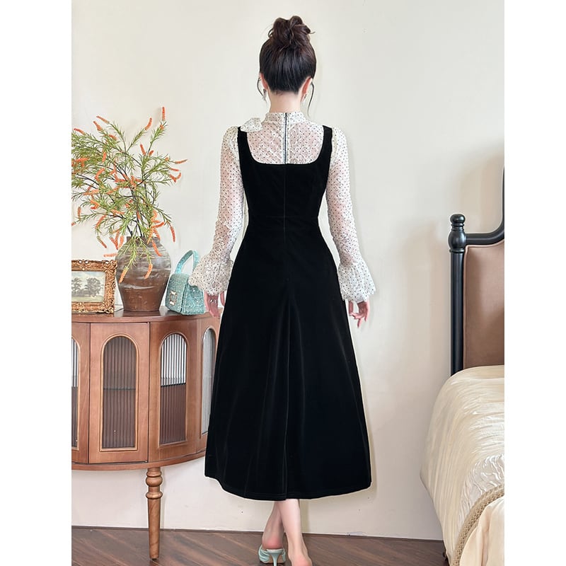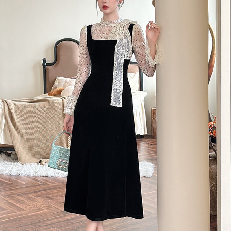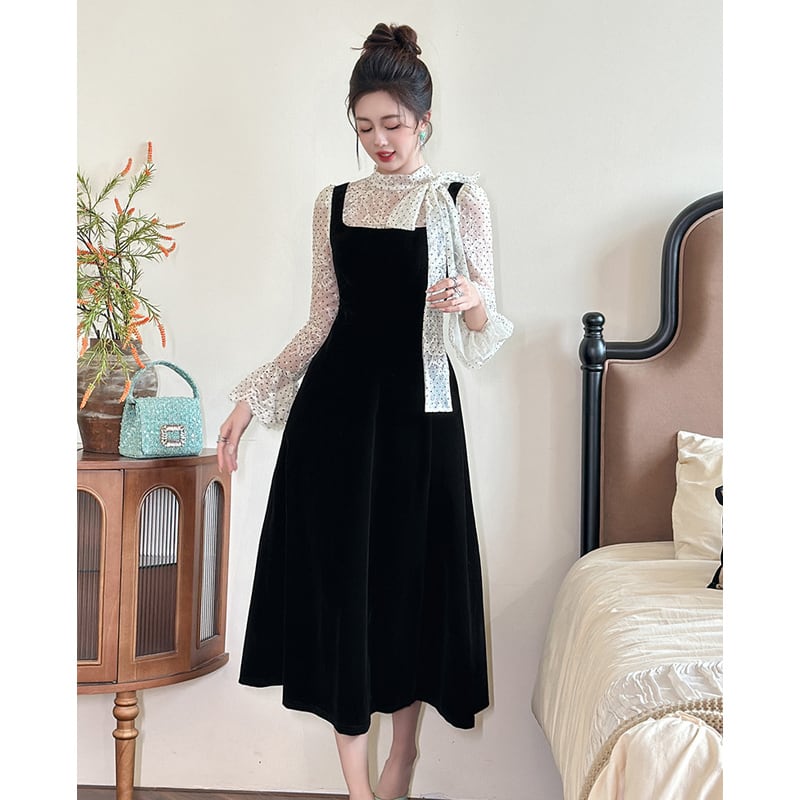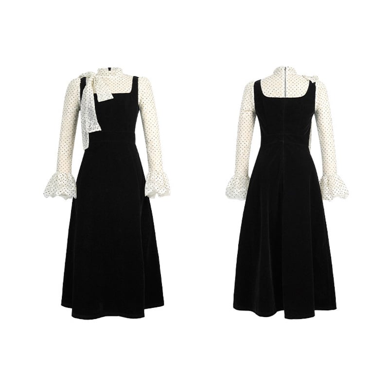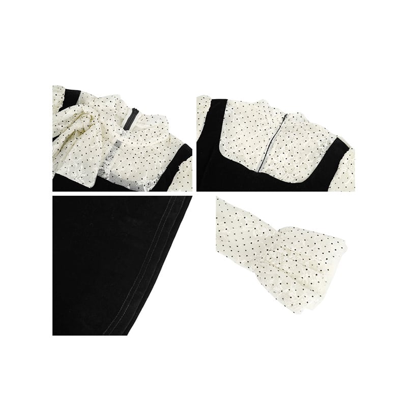【夕暮薔薇シリーズ】ワンピース フレンチスタイル ドット柄 ベルベット M L XL