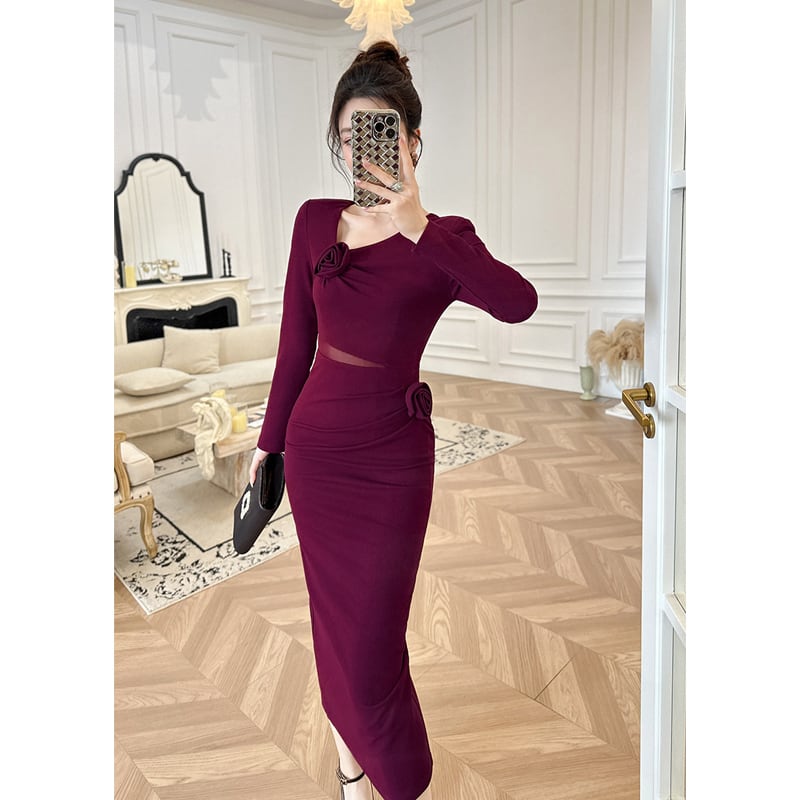 【夕暮薔薇シリーズ】ワンピース 立体花飾り ウエストシェイプ 細く見せる S M L XL
