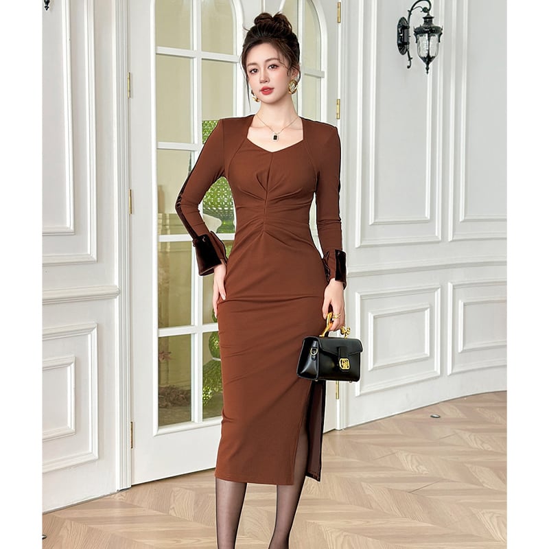 【夕暮薔薇シリーズ】ワンピース スクエアネック ウエストシェイプ コーヒー色 S M L XL