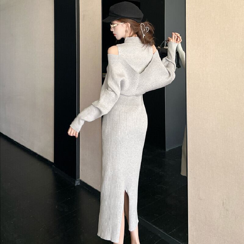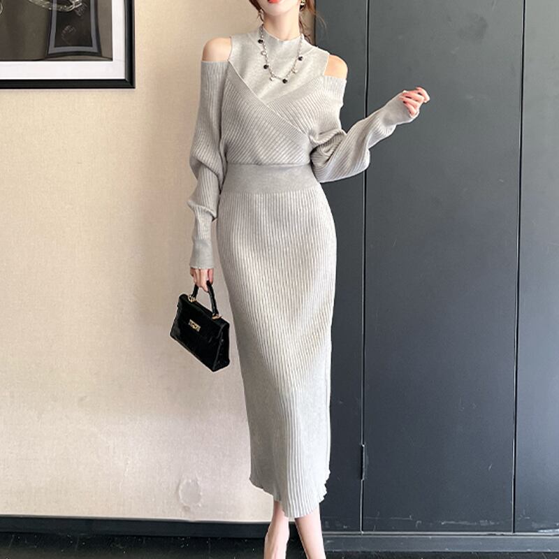 【CHERRYシリーズ】ワンピース オフショルダー ニット ライトグレー S M L