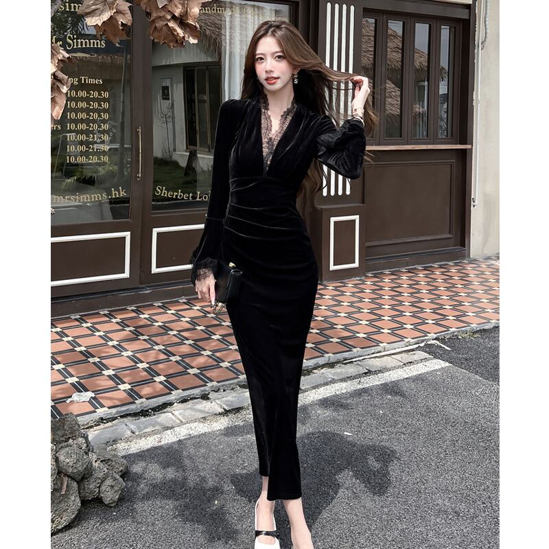 【CHERRYシリーズ】ワンピース レース 視線集中 ベルベット ブラック S M L
