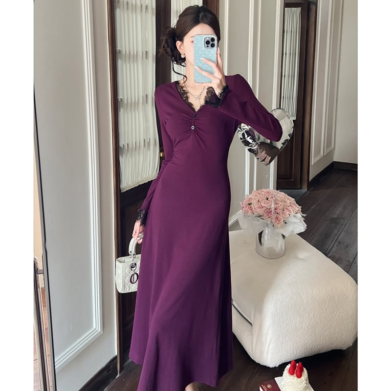 【CHERRYシリーズ】ワンピース 2色展開 レース 気質溢れる パープル ブラック S M L
