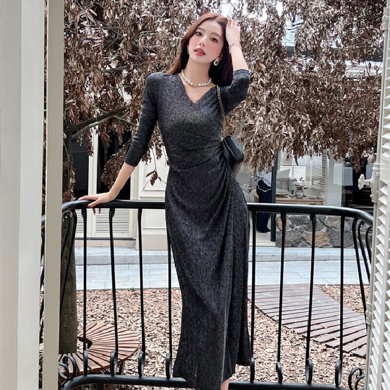 【CHERRYシリーズ】Vネック ドレープ 上品でゴージャス プリーツドレス S M L XL