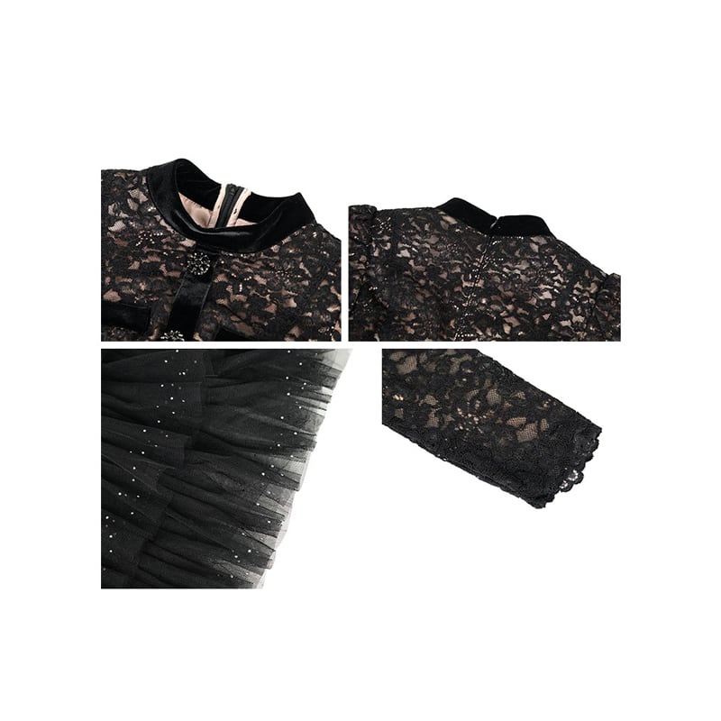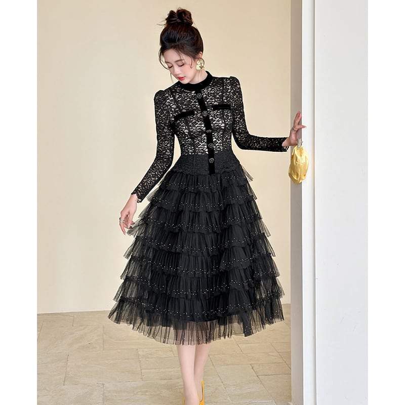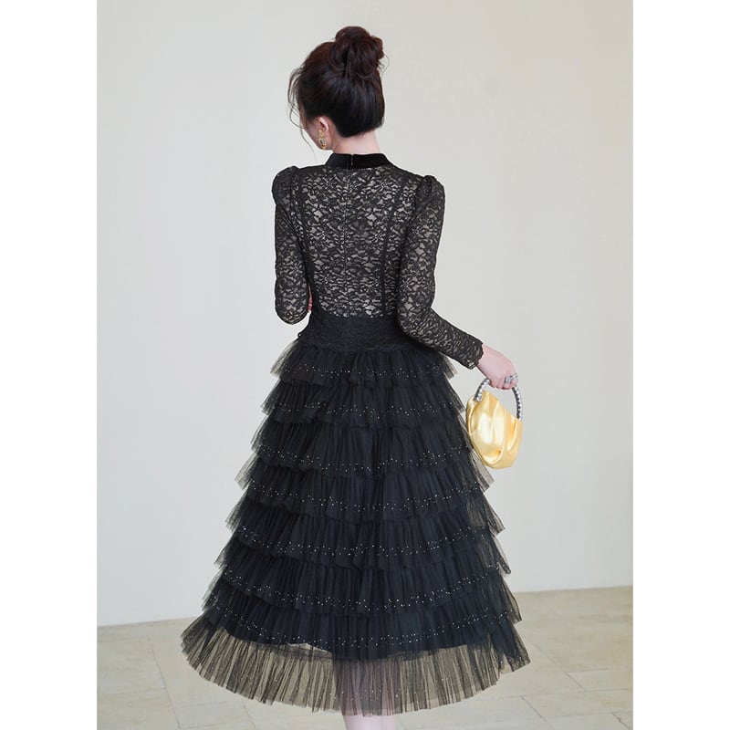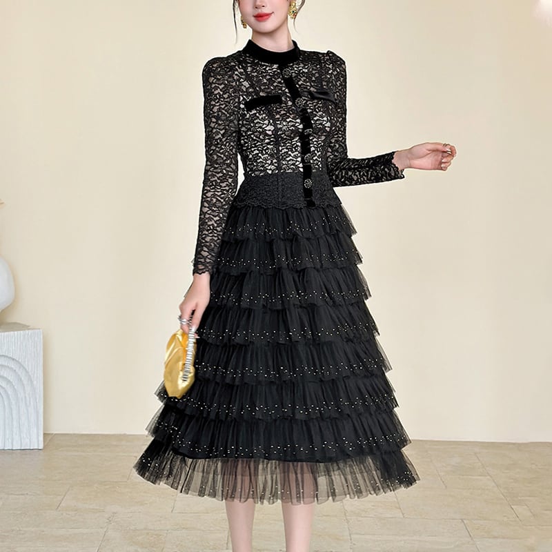 【夕暮薔薇シリーズ】ワンピース レース ティアード 長袖 ブラック S M L XL