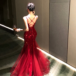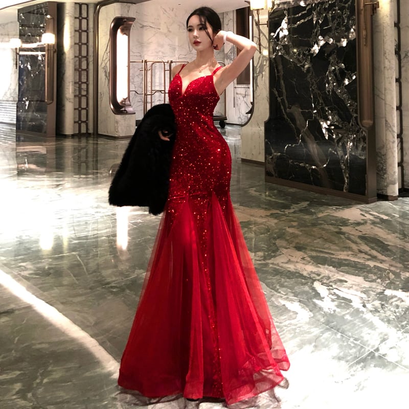 ☆人魚姫ドレス☆スパンコール マーメイドシルエット パーティードレス レッド