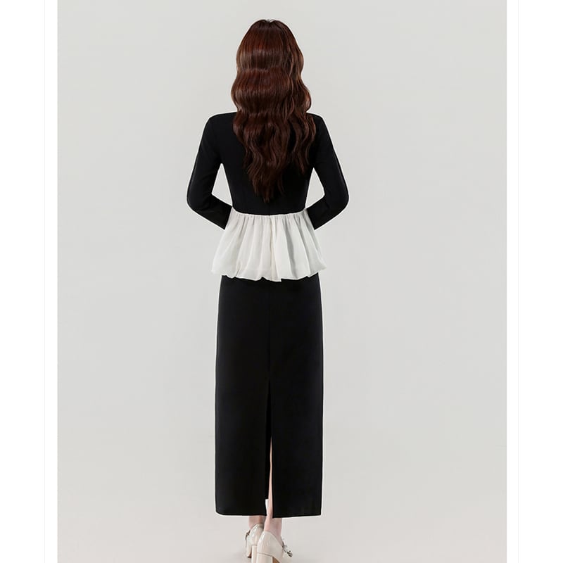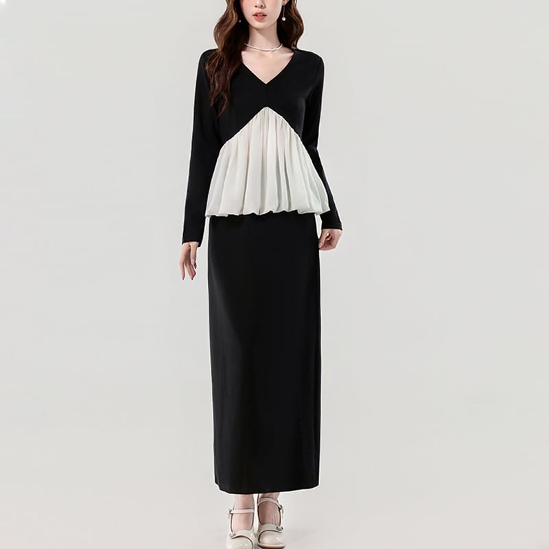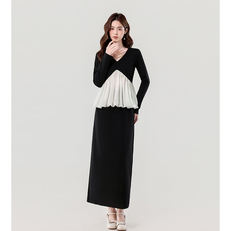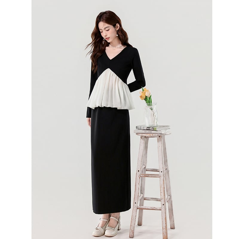 セットアップ Vネック ペプラム トップス+スカート デザイン感 ブラック S M L XL