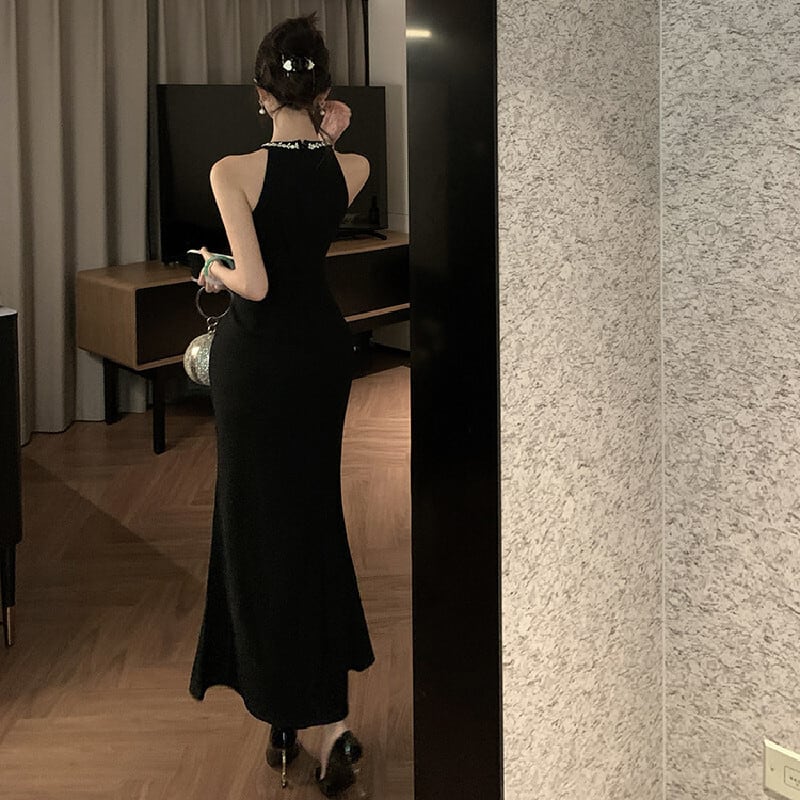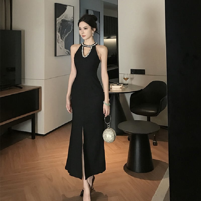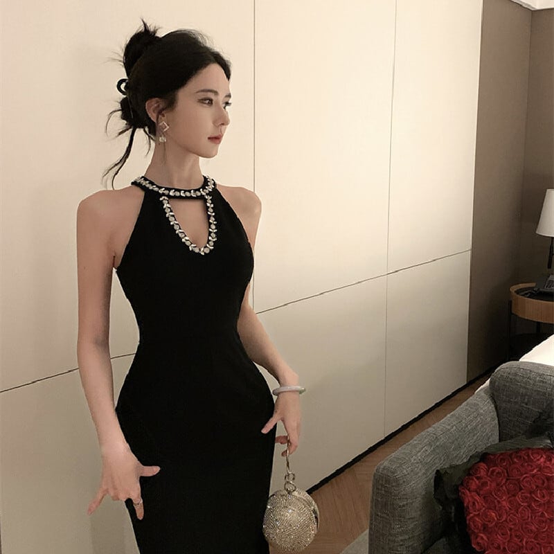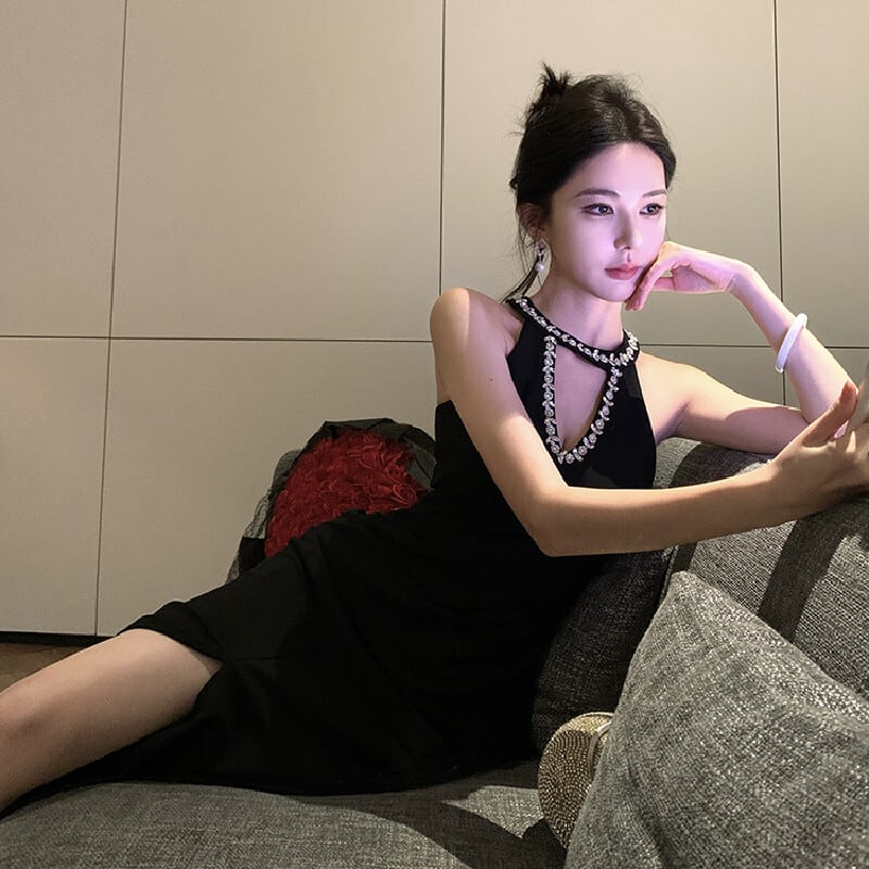 ホルターネックドレス ラインストーン スリット 飲み会 ブラック
