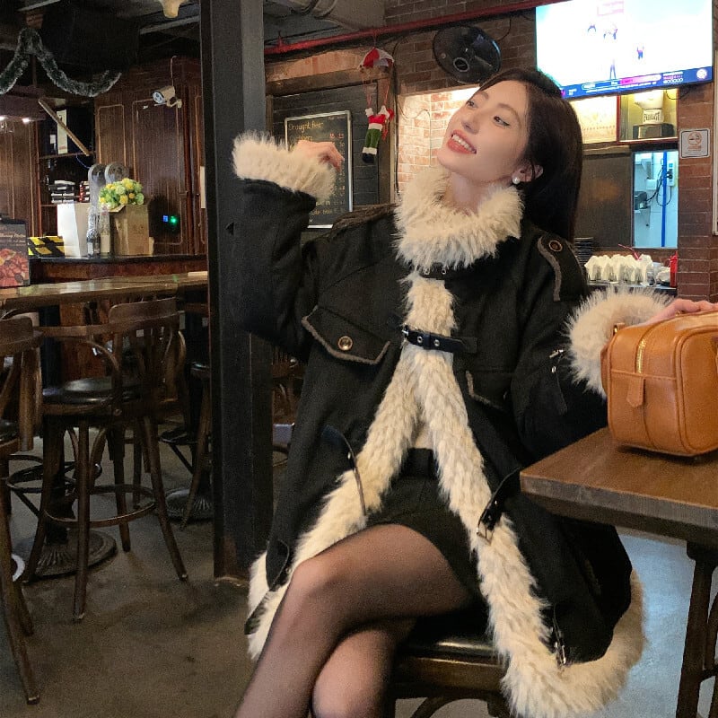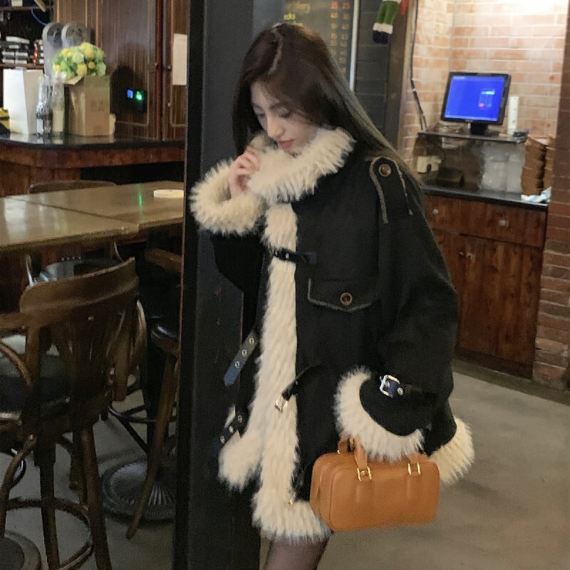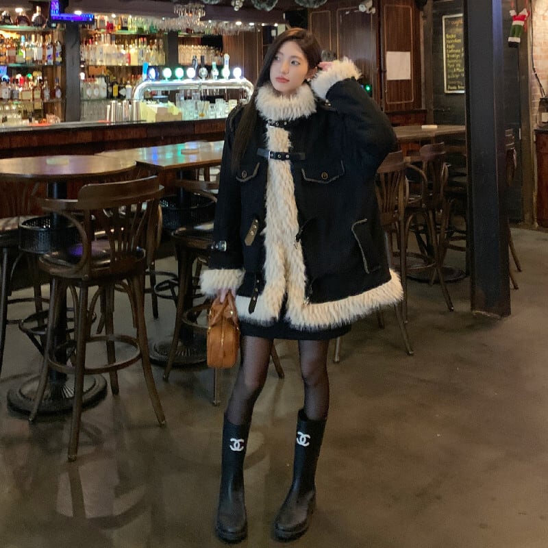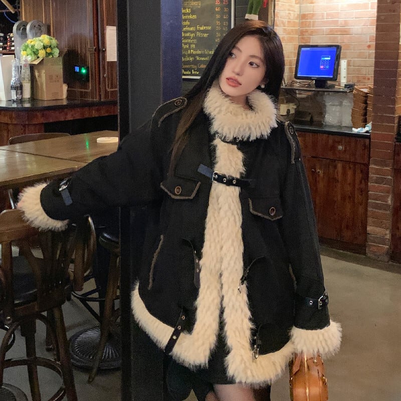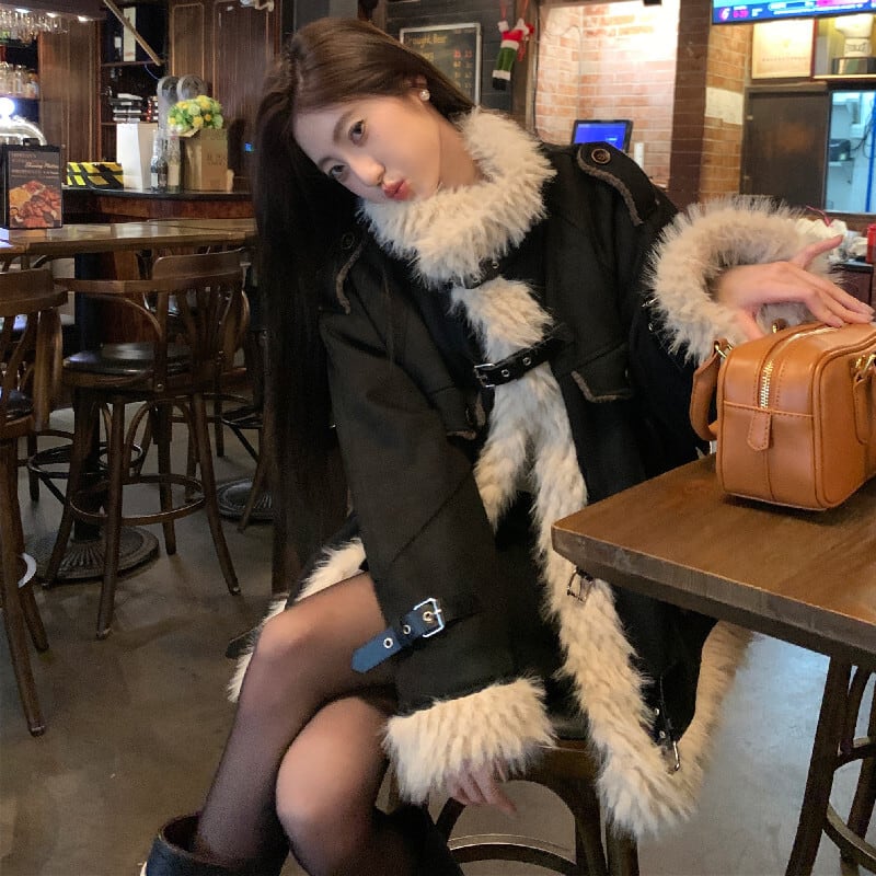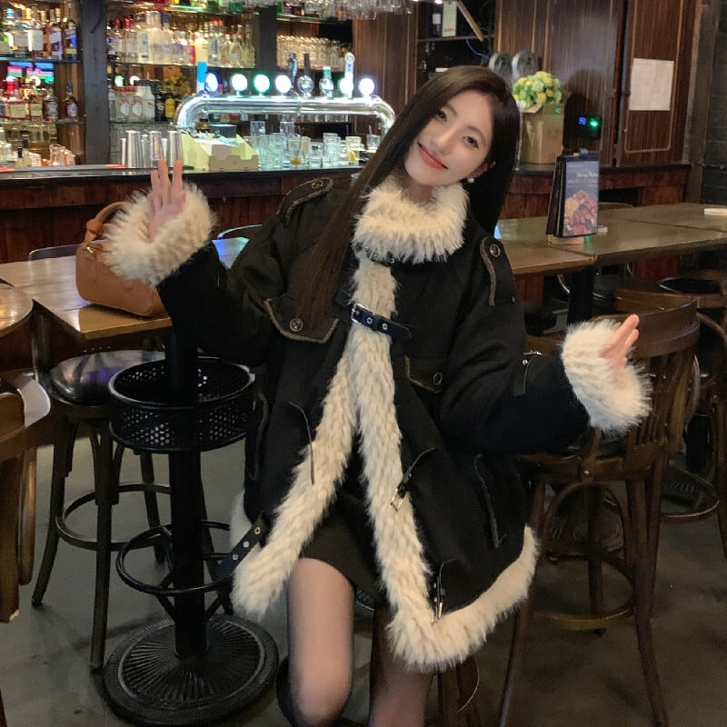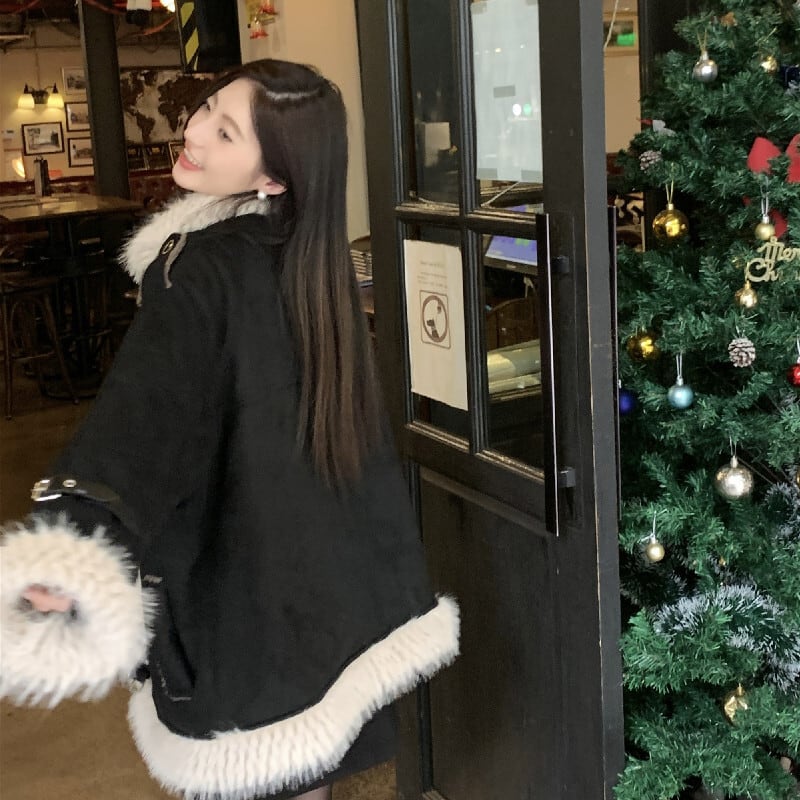 アウター スタンドカラー ファーライニング ルーズ ブラック コート