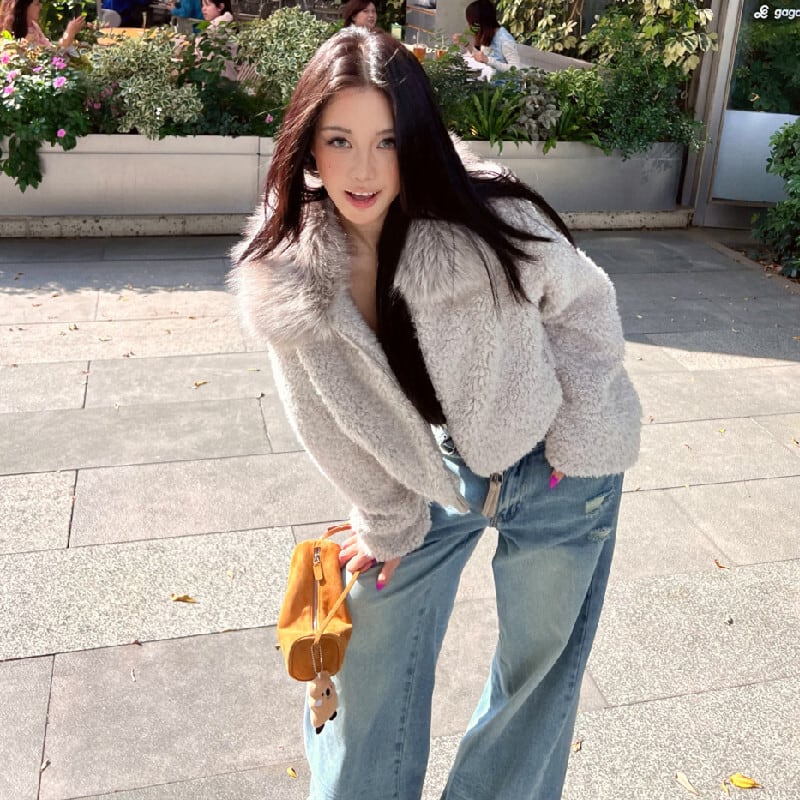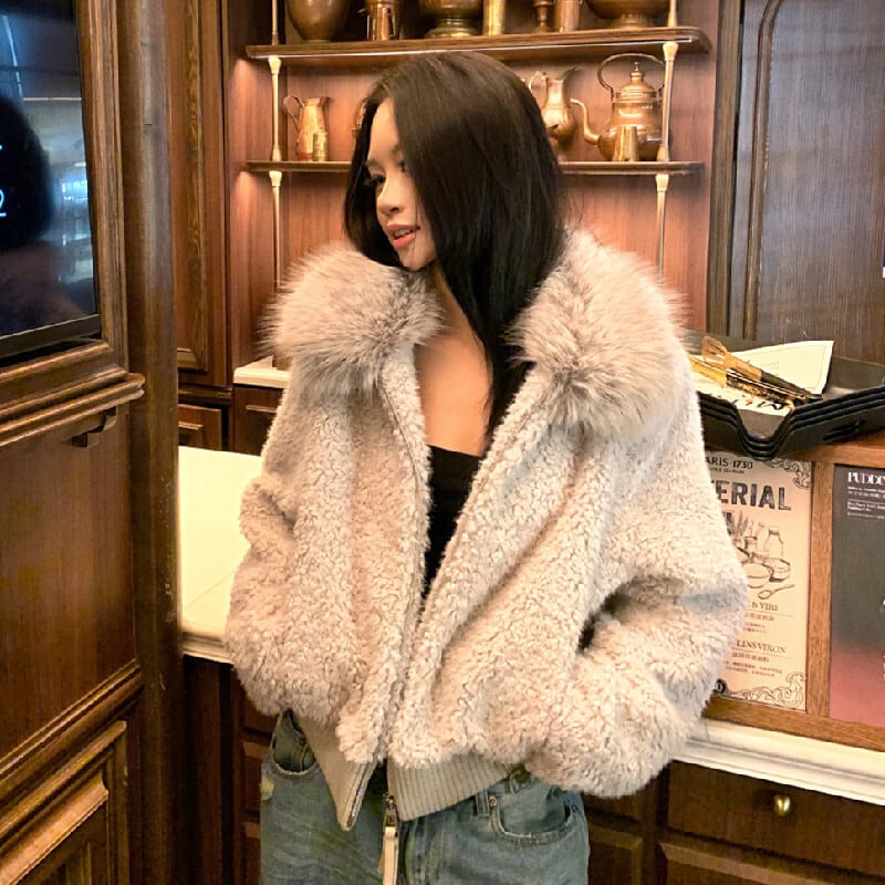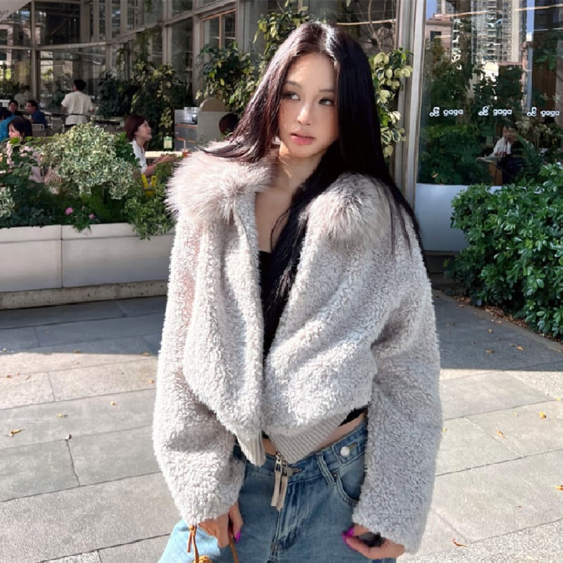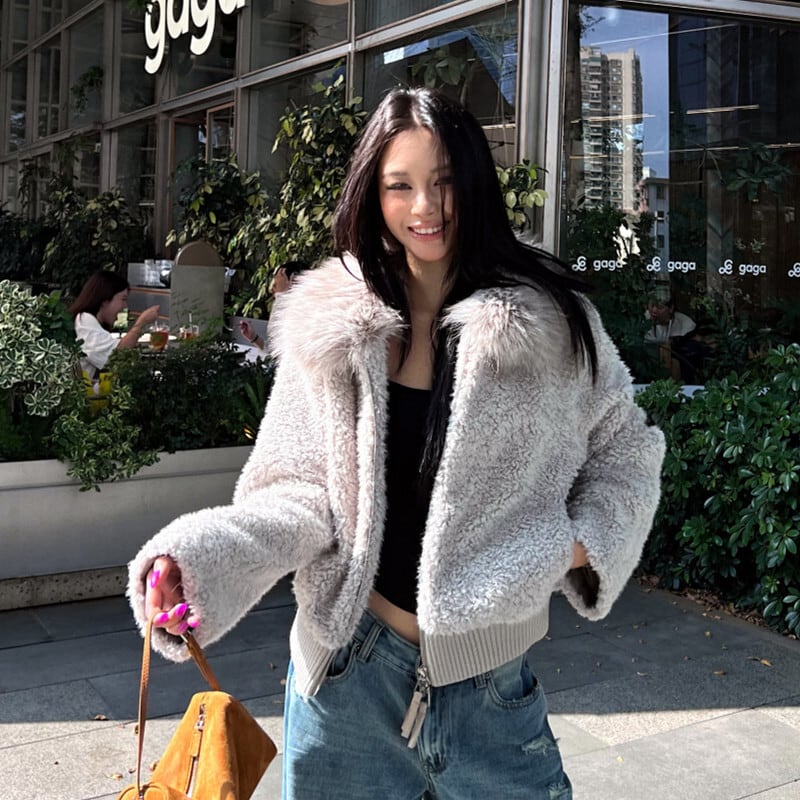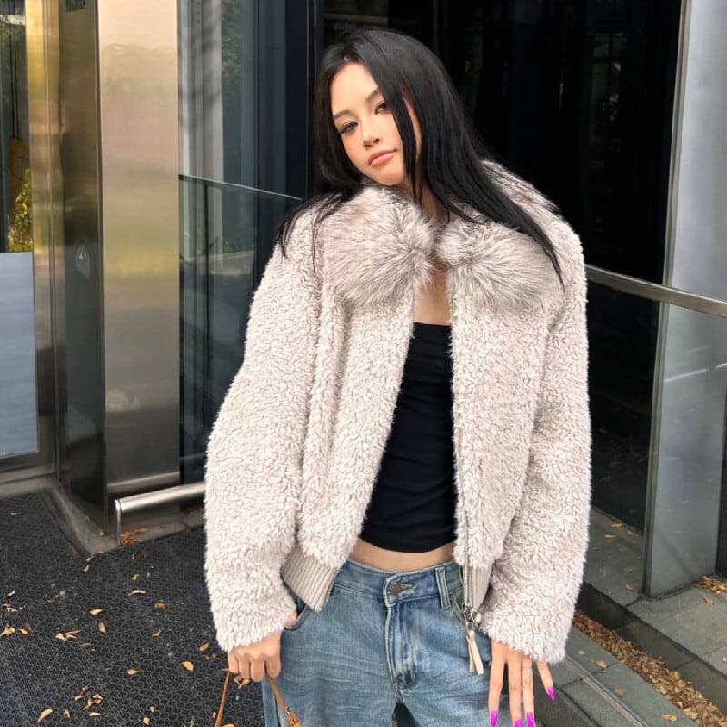 アウター ルーズフィット ファーフード付きジップアップ ジッパー グレー S M L