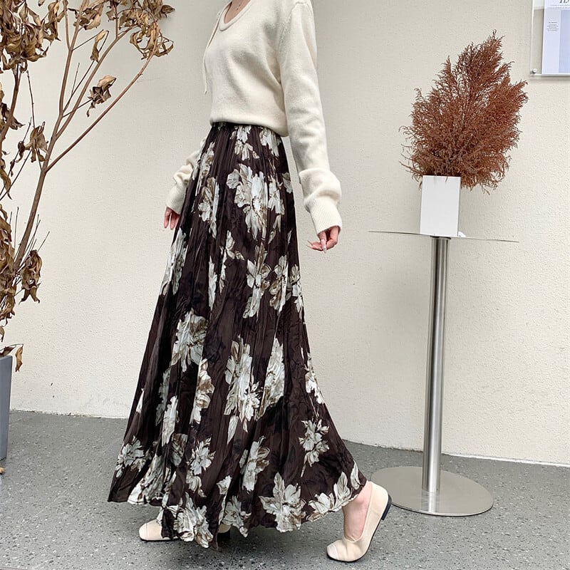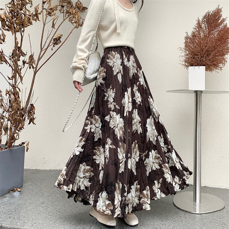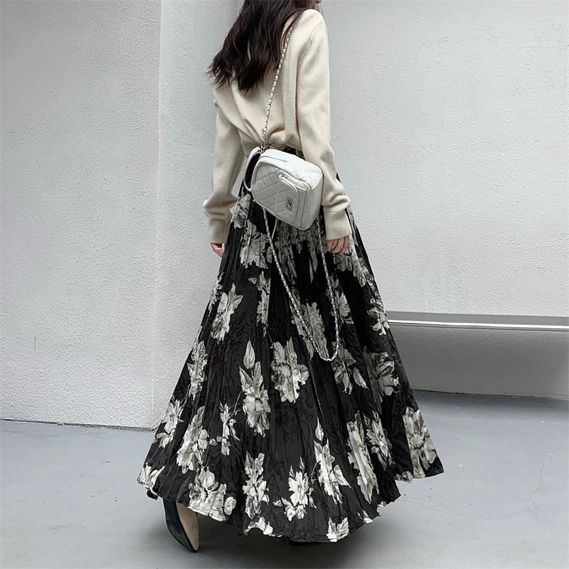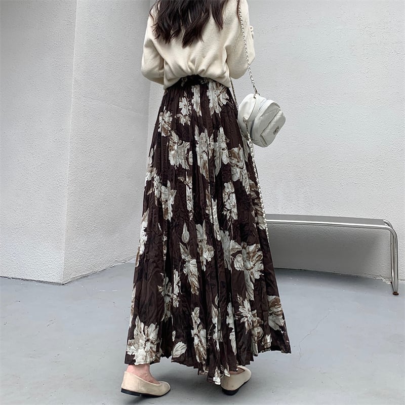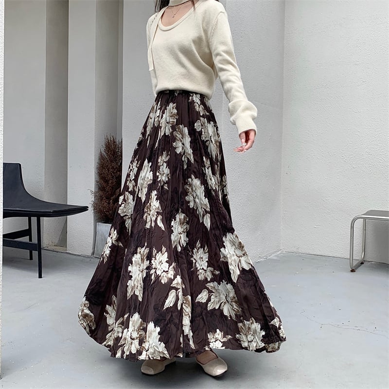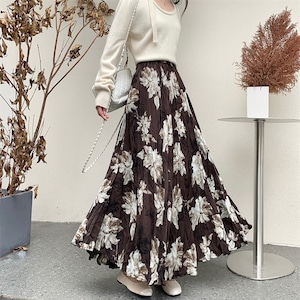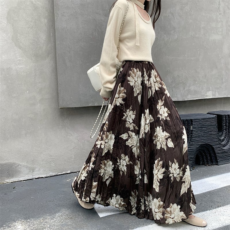 ボトムス スカート 花柄 ロング丈 不规则プリーズ コーヒー色 ブラック