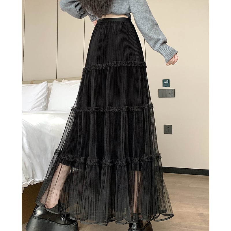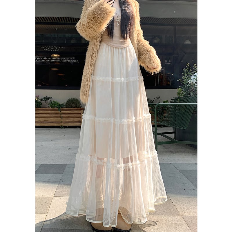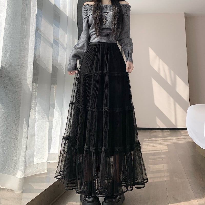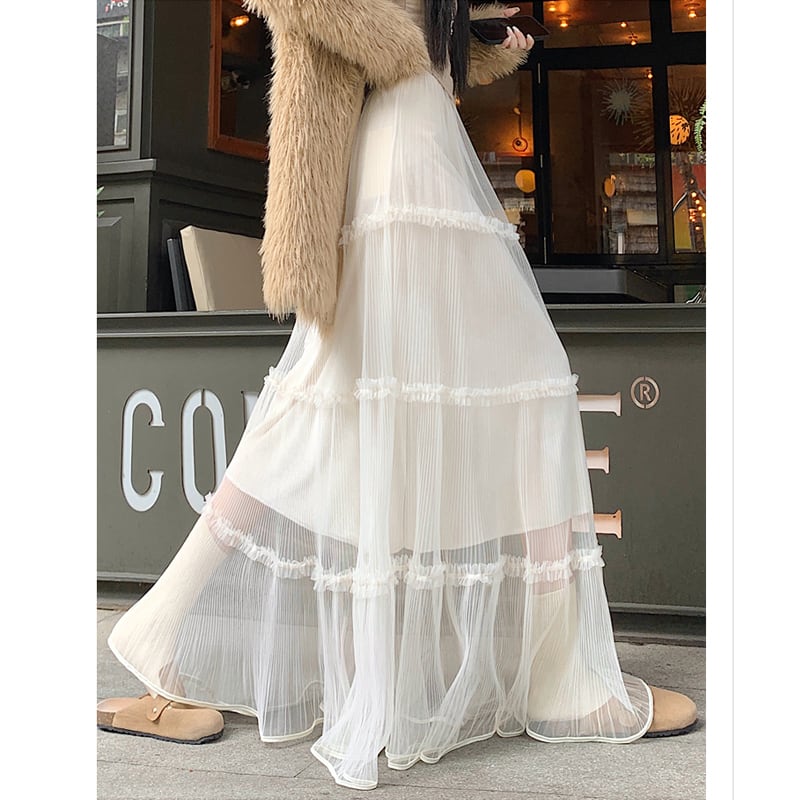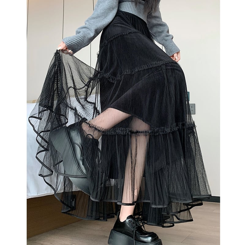 ボトムス スカート ベルベットとメッシュの重ね合わせ ロングスカート ベージュ ブラック