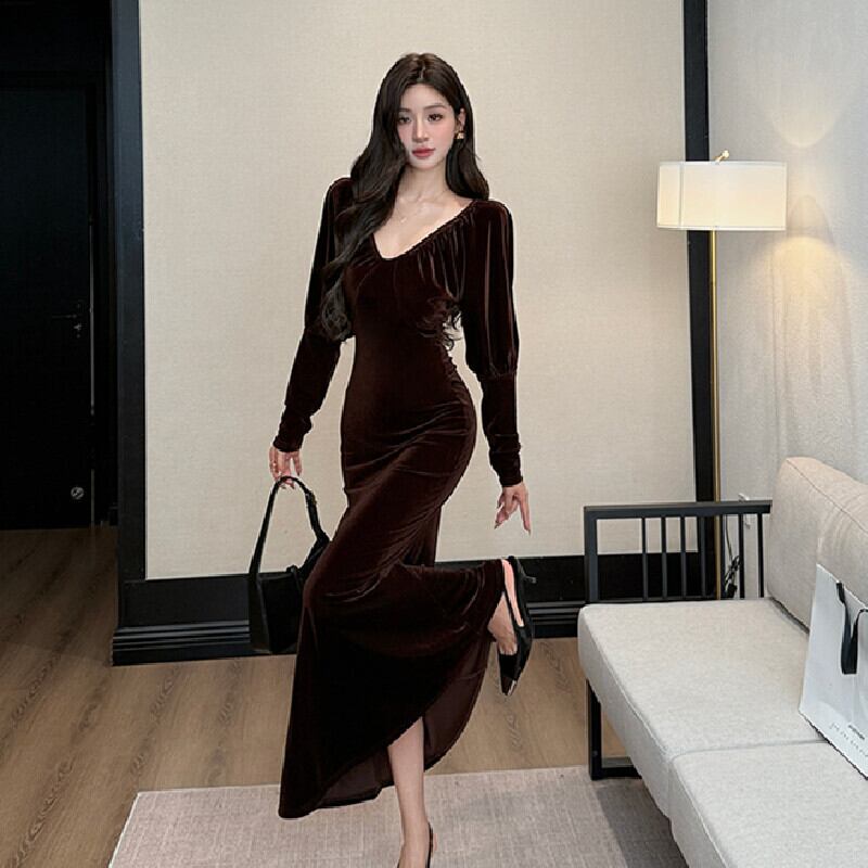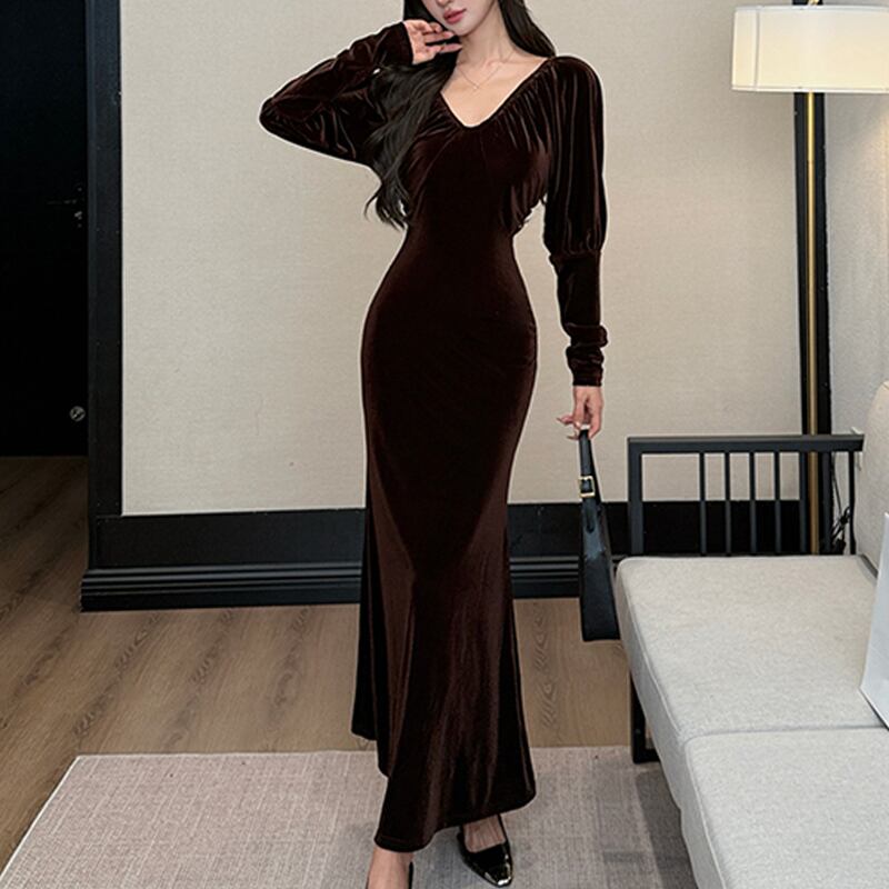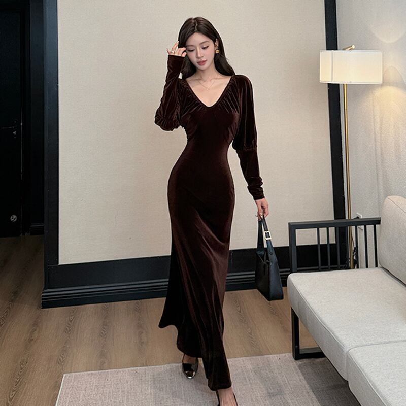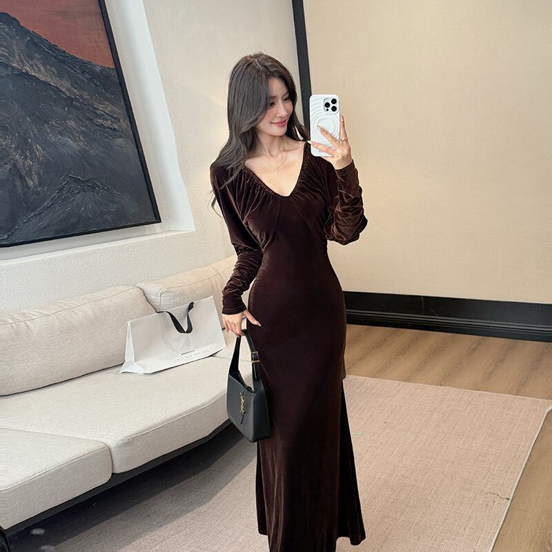 ワンピース Vネック ベルベット 長袖 気質溢れる コーヒー色 S M L XL