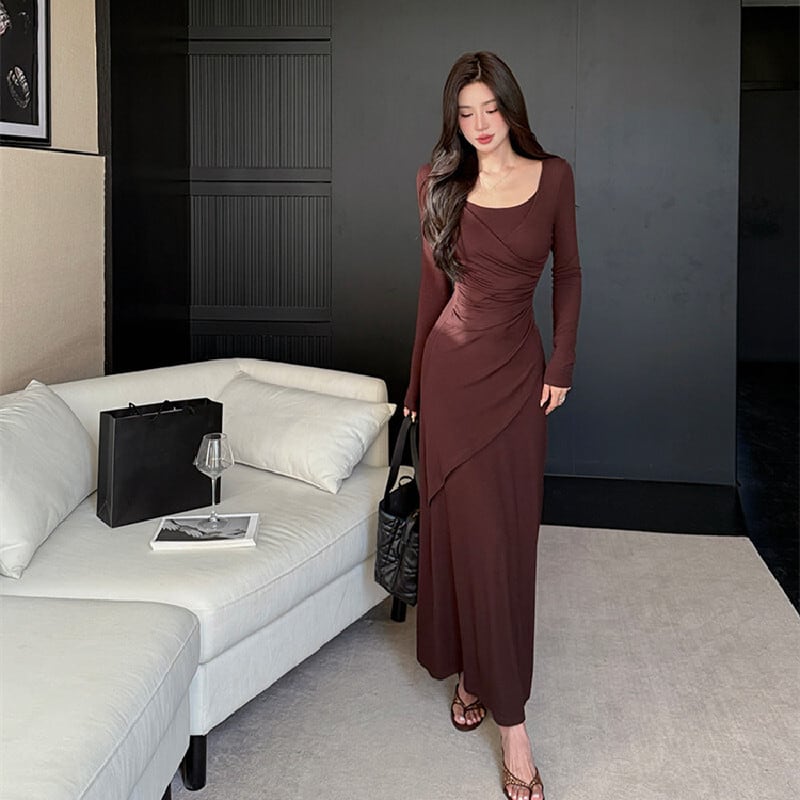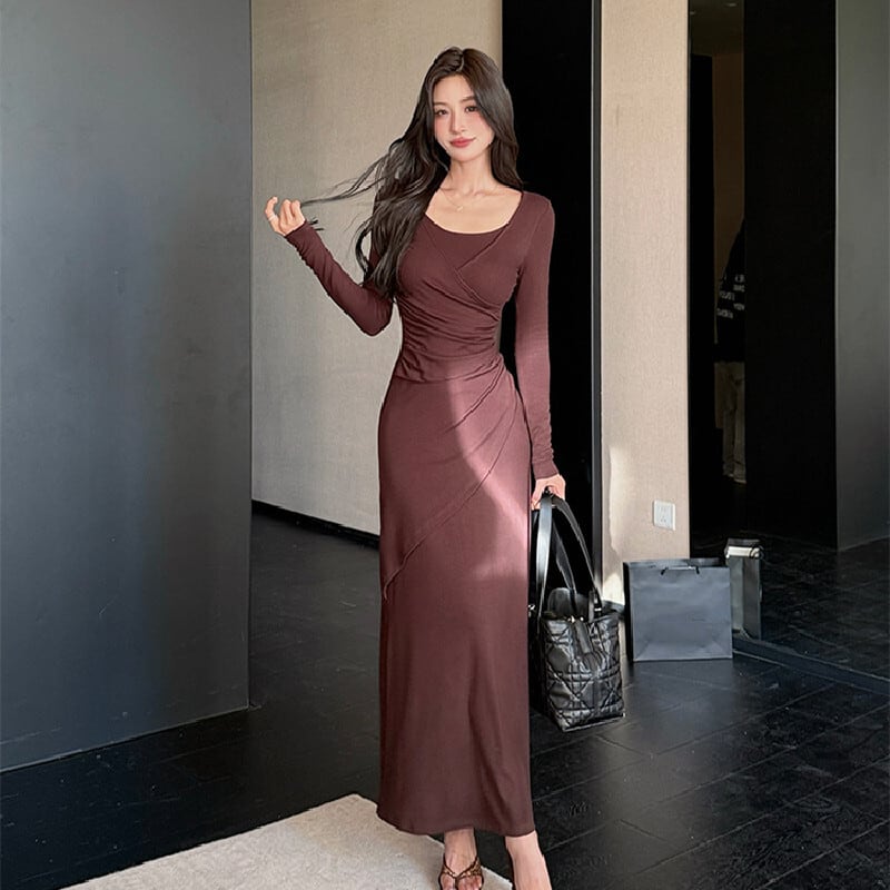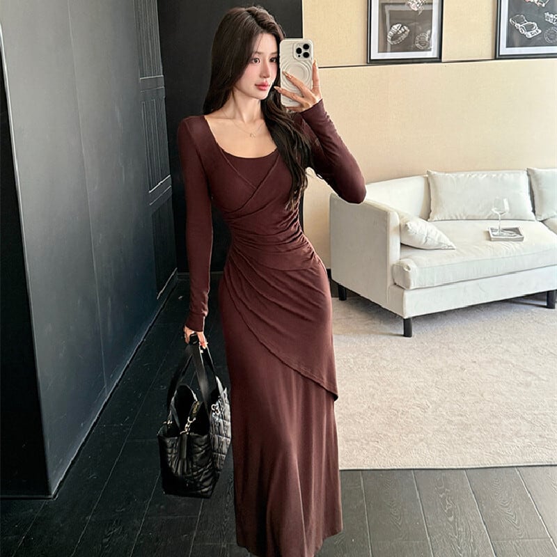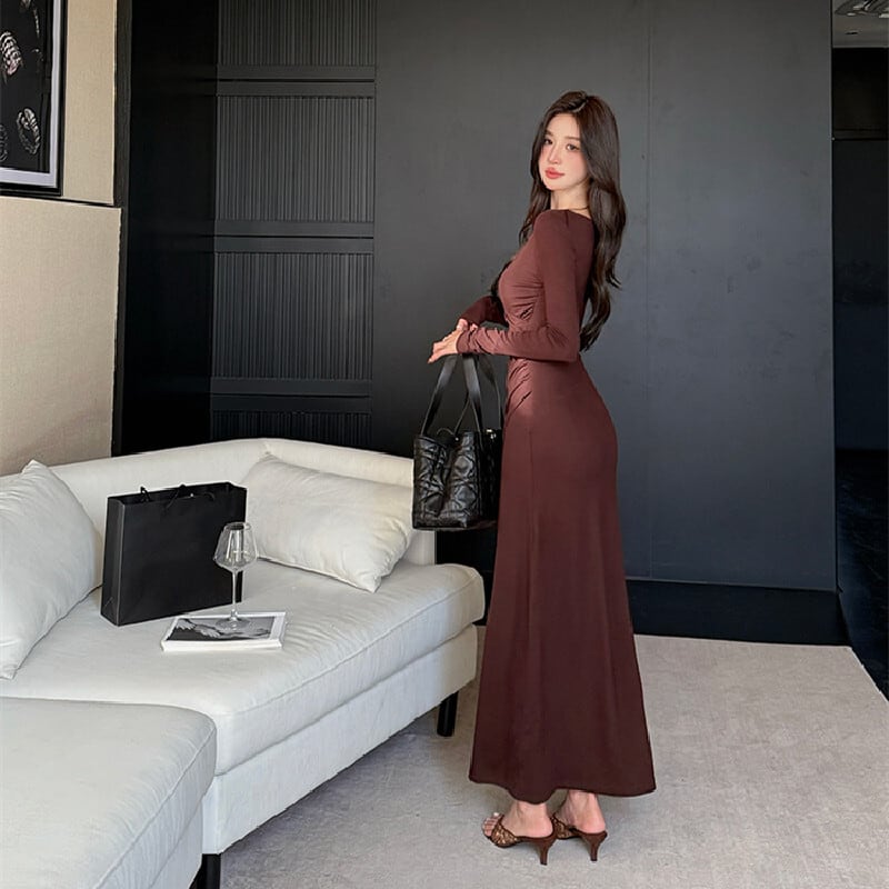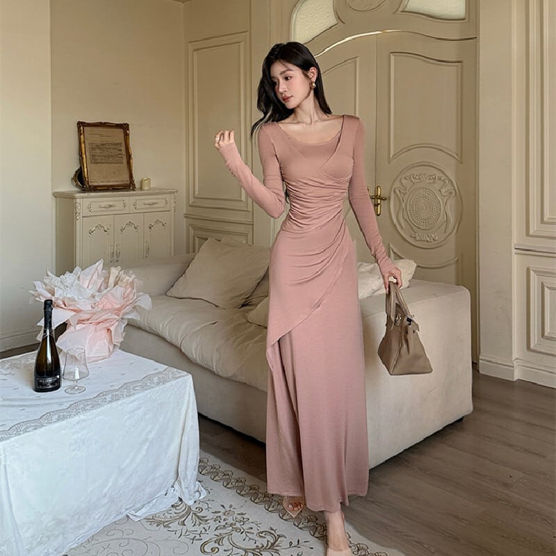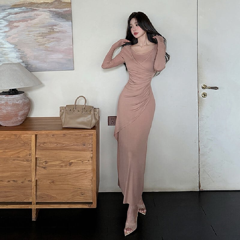 ワンピース 2色展開 長袖 くびれデザイン エレガント ピンク ブラウン S M L XL