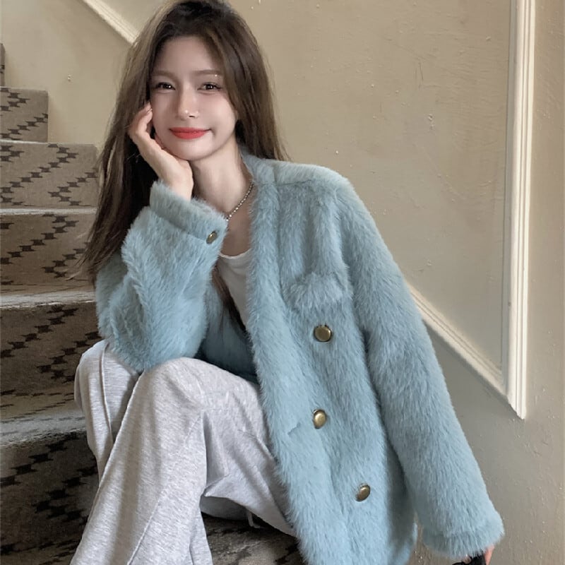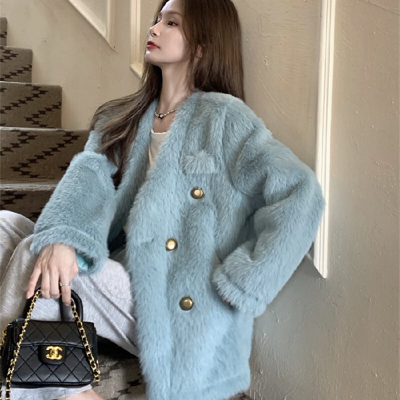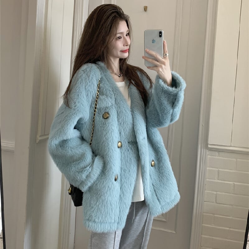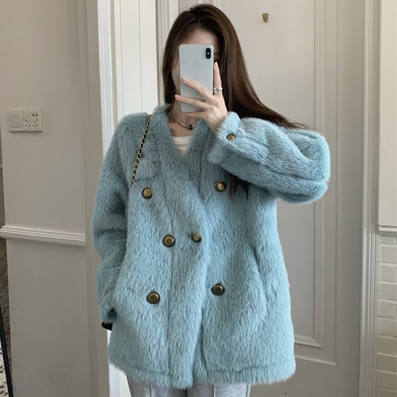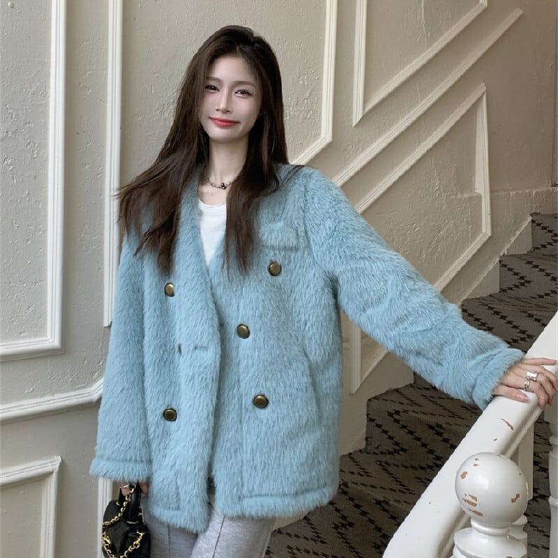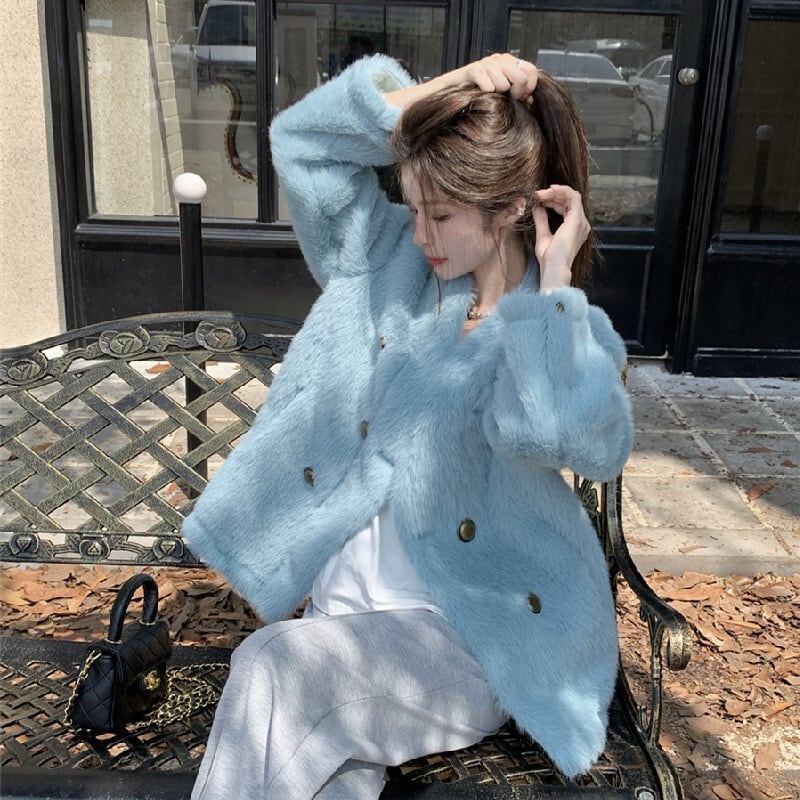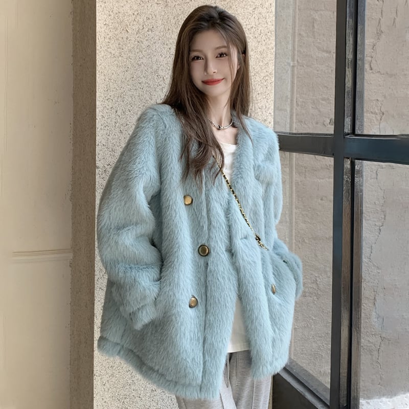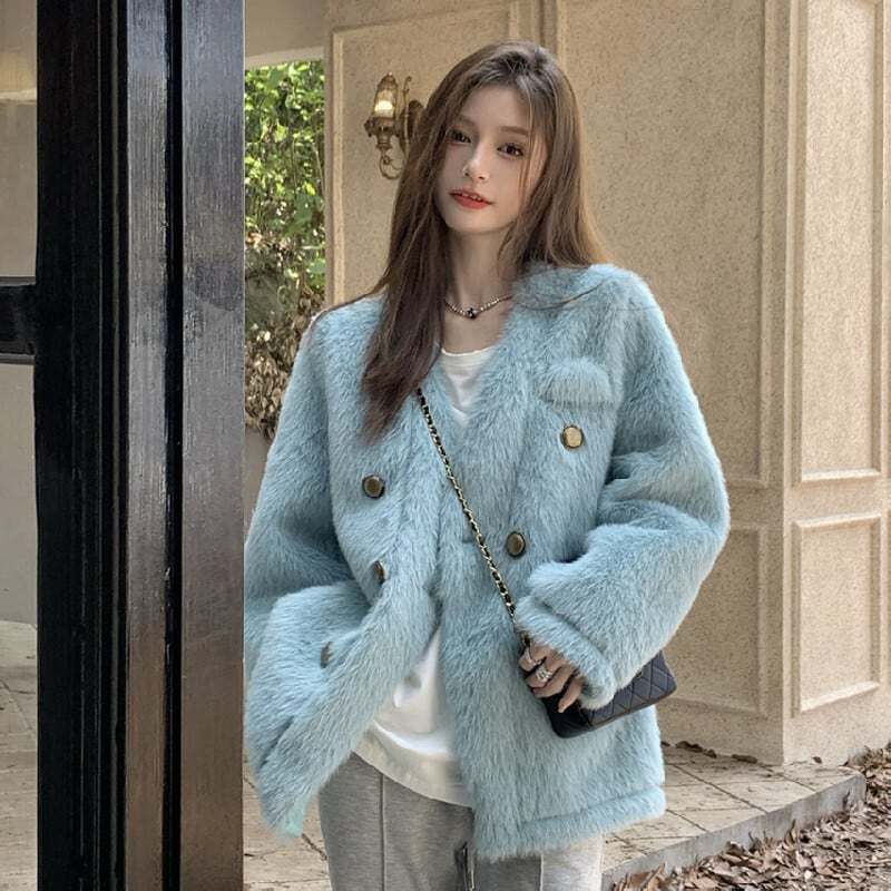 アウター ダブルブレスト 水色 フェイクファー ソフト ブルー