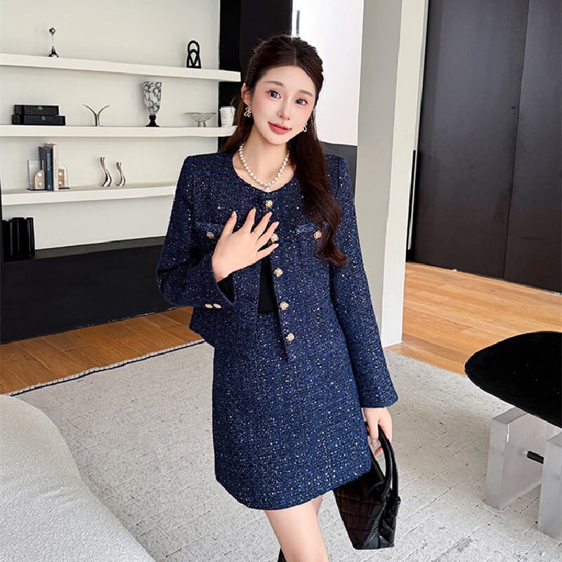 セットアップ ジャケット+スカート ツイード 通勤 ダークブルー S M L XL