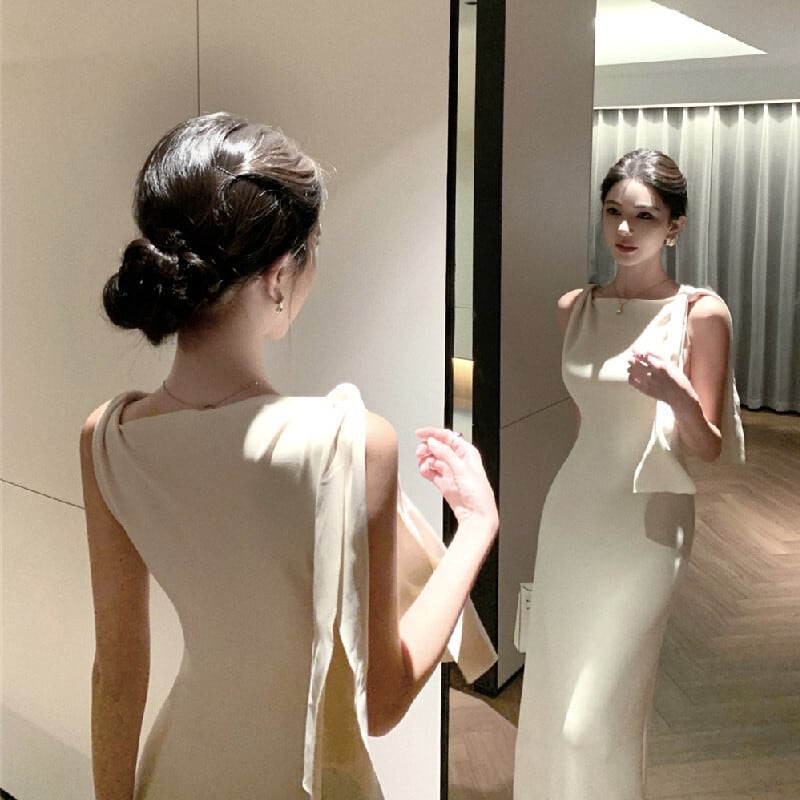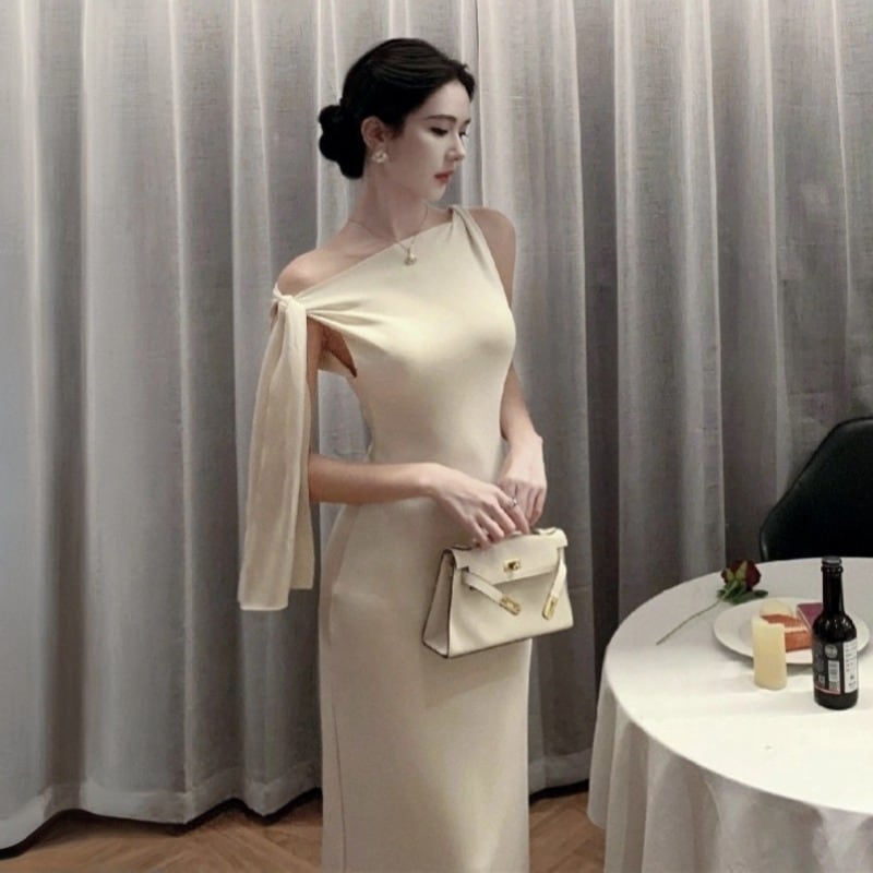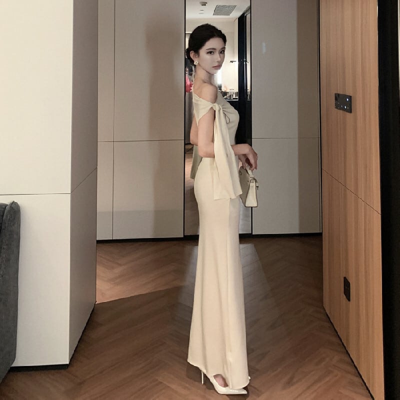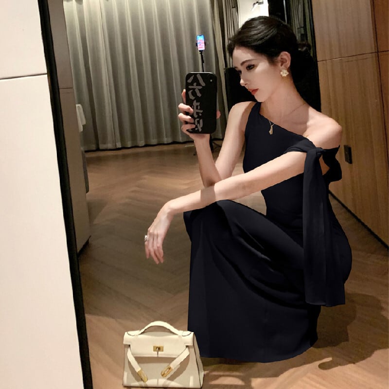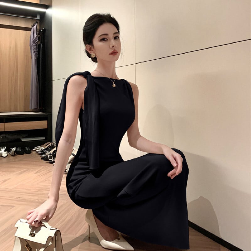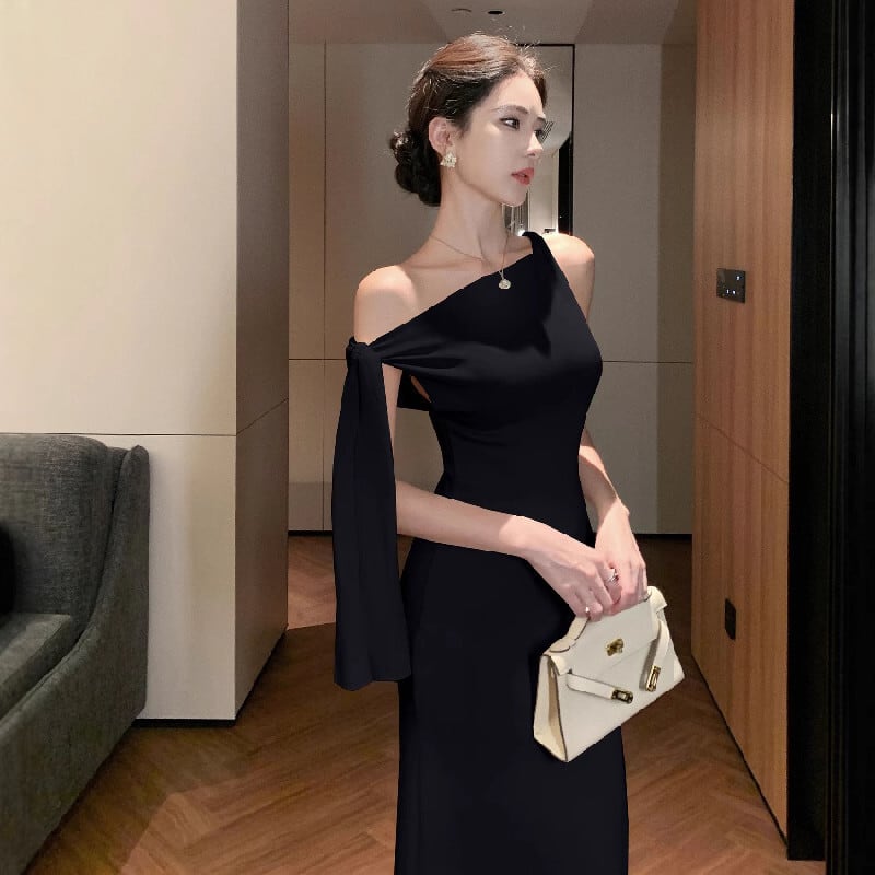 ワンピース オフショルダー リボン シンプルシルエット ベージュ ブラック S M L