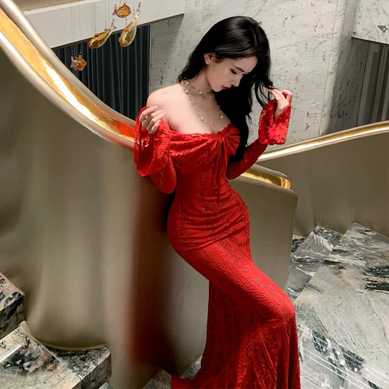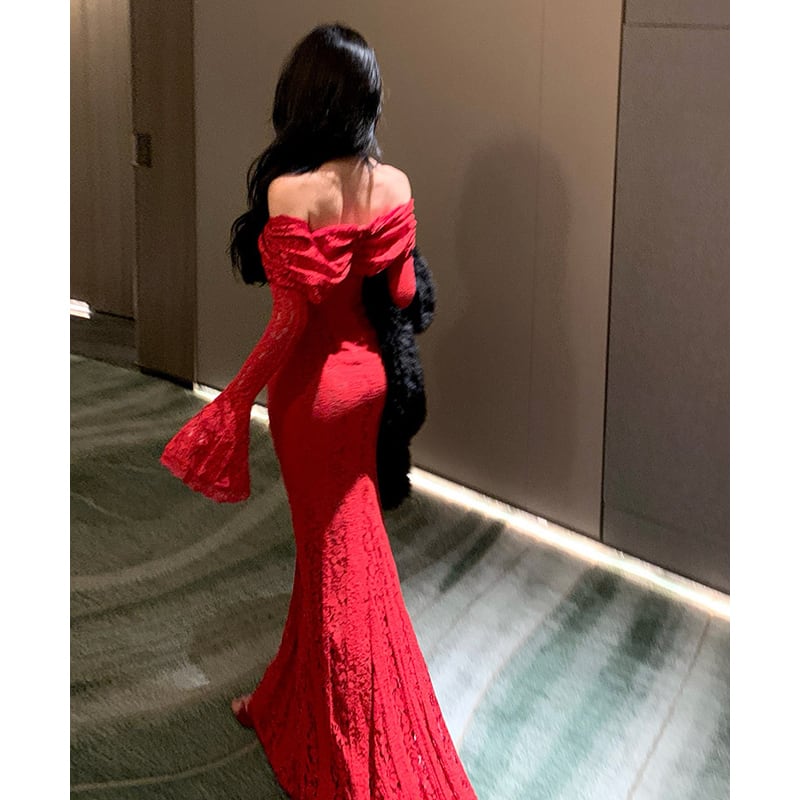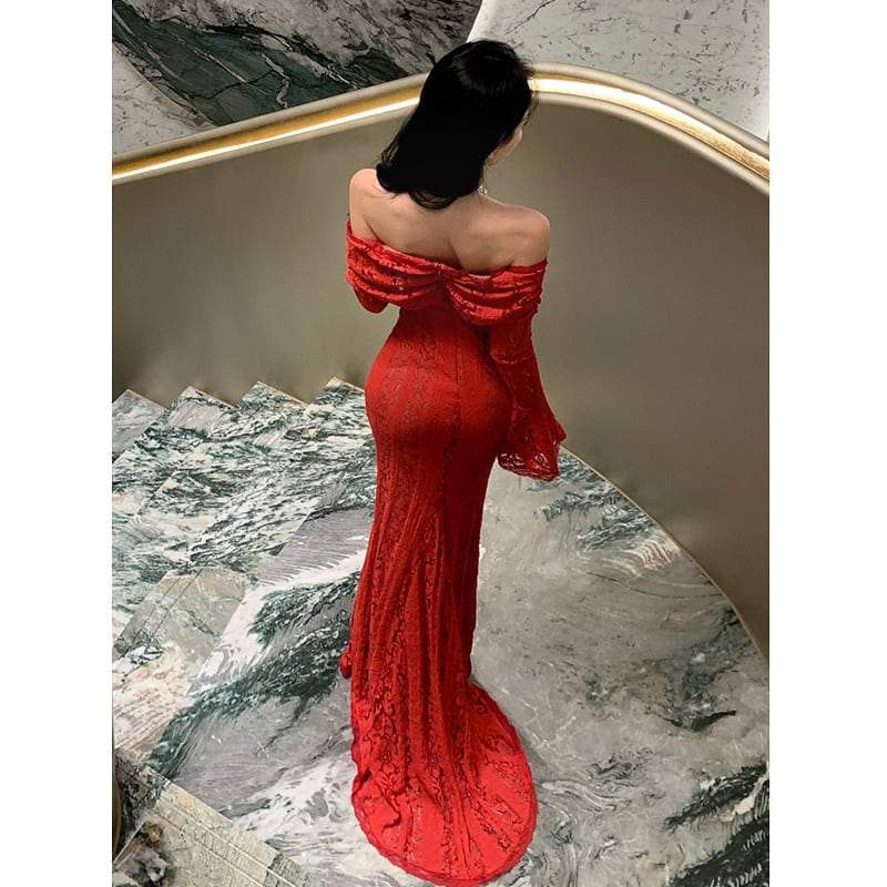 ワンピース ボートネックデザイン レース シルエット レッド S M L