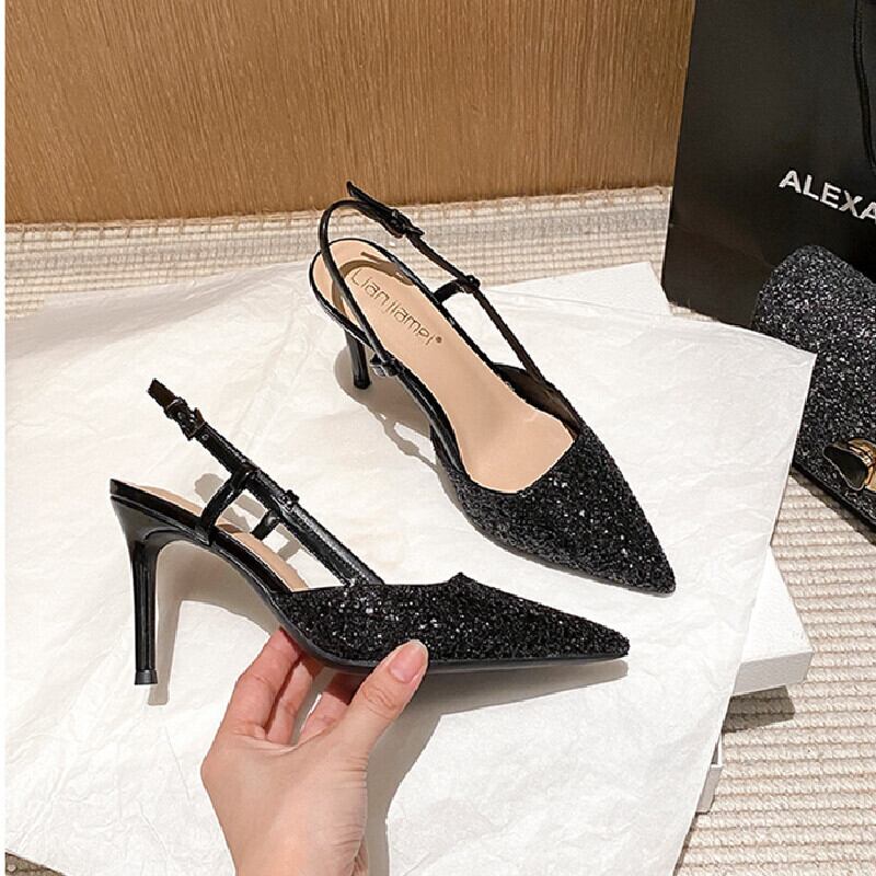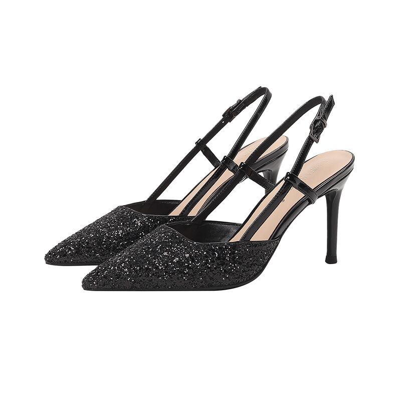 シューズ サンダル パーティーヒール スパンコール ブラック 8CM