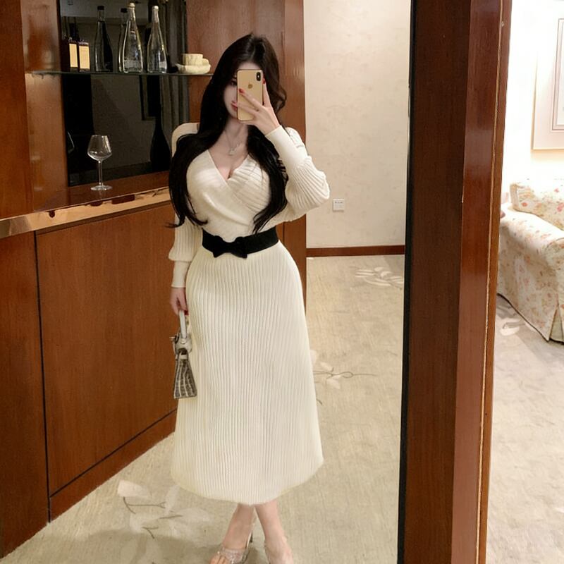 2colors スリムフィット ニットワンピース 大人フェミニン ホワイト ブラック