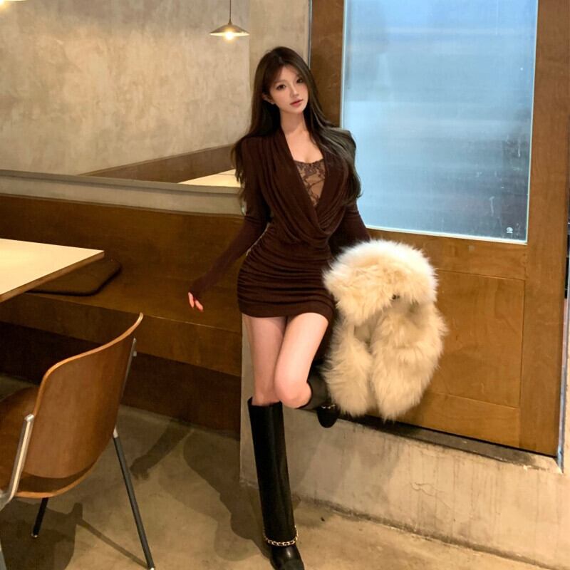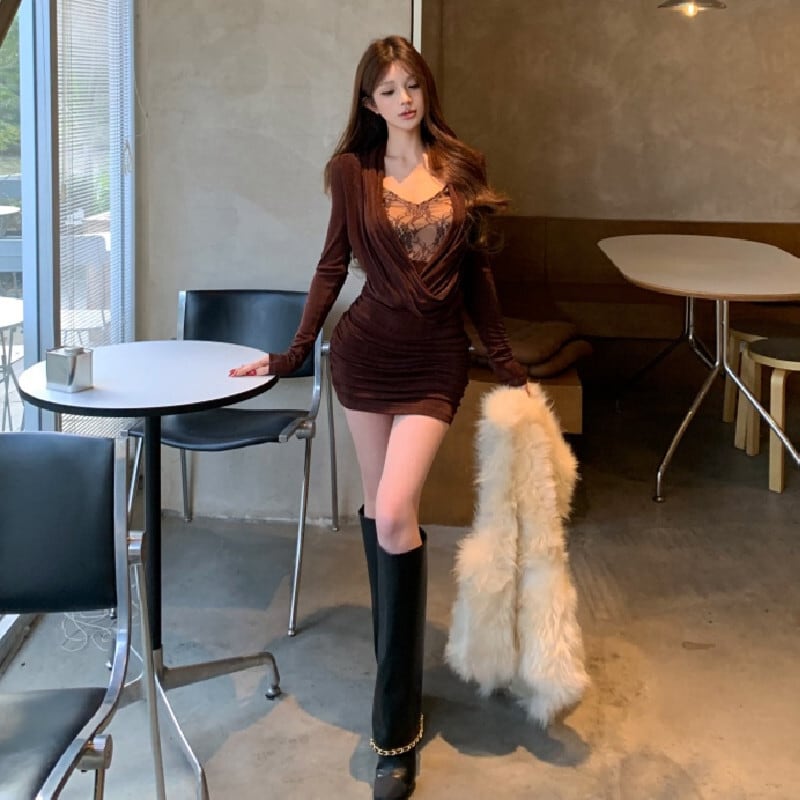 ワンピース レース ミニ丈 シルエット 長袖 コーヒー色 S M L