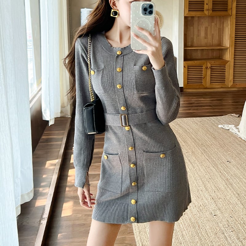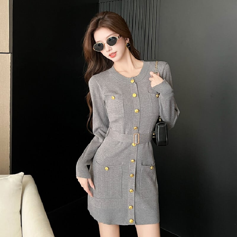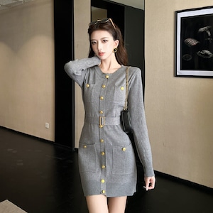 【CHERRYシリーズ】ワンピース ニット ラウンドネック シングルブレスト グレー
