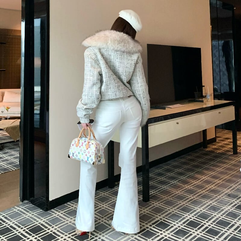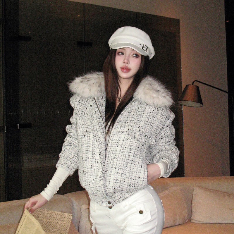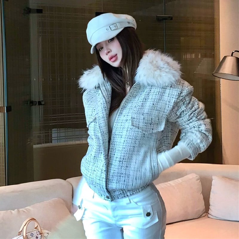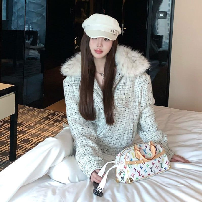 シティガールファッション ツイード ゆったり ファー付き キルティングジャケット