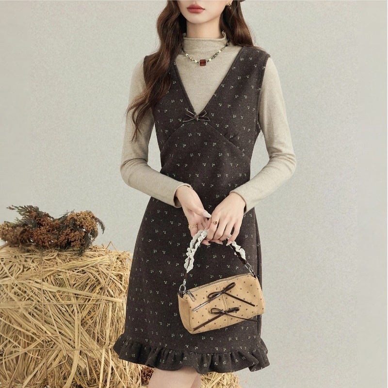 花柄 Vネック レトロ フリル ショート丈 ニットトップス+キャミワンピース