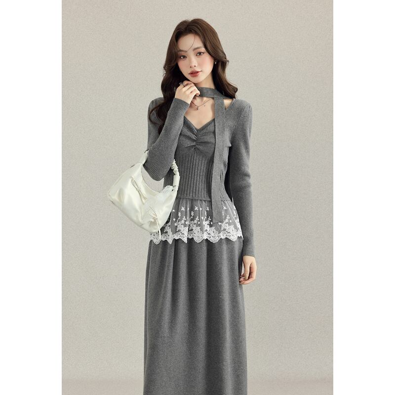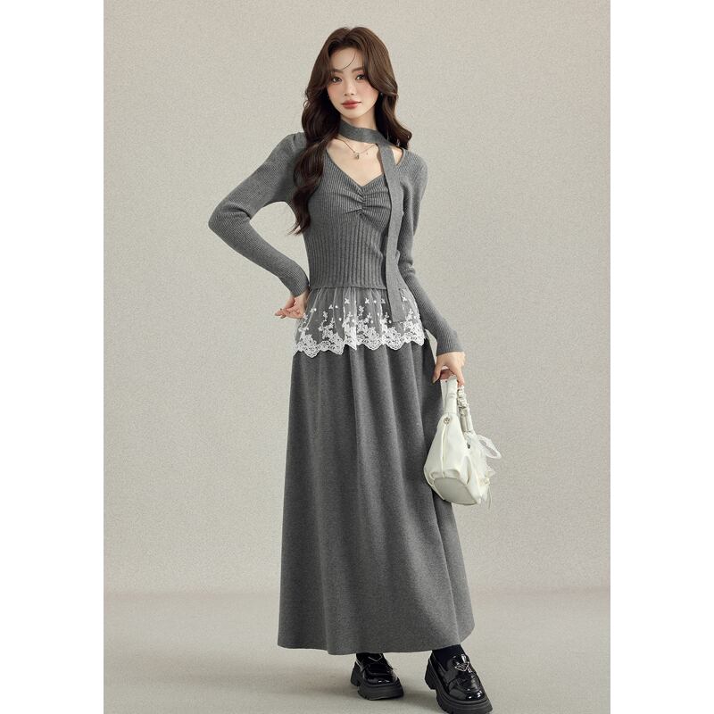 セットアップ トップス+スカート ニット レーストリム エレガント グレー