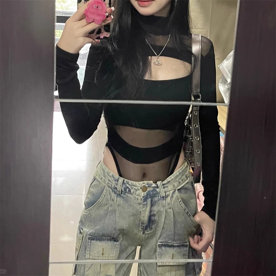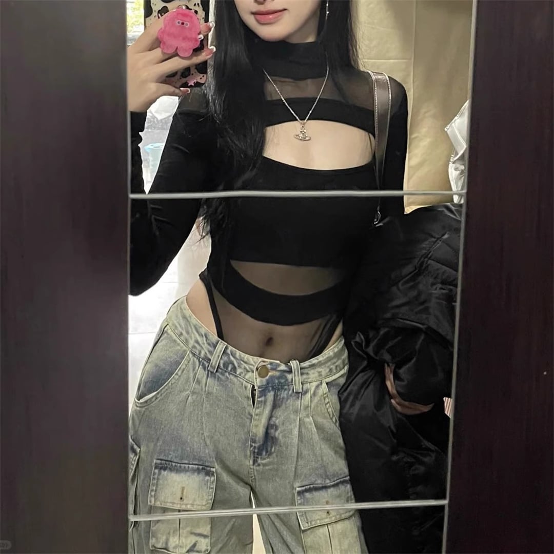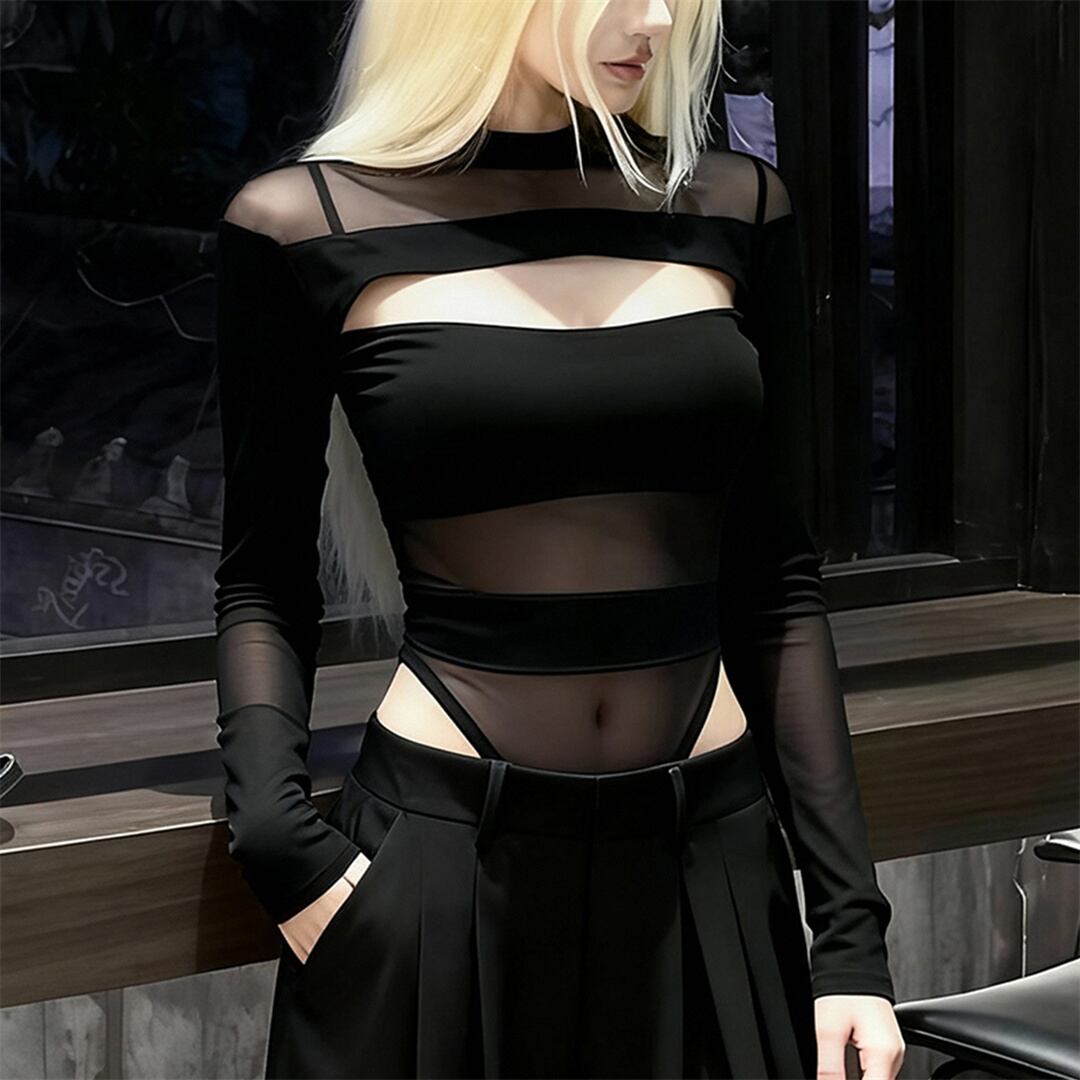 トップス セクシー 透かし彫り レース ボディコン ボディスーツ ブラック S M L