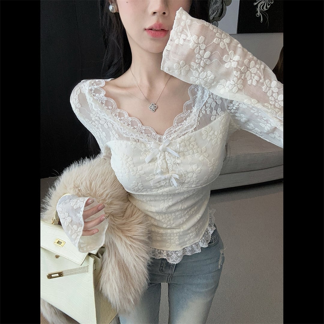 トップス 純欲 レース Vネック 肌見え アプリコット S M L