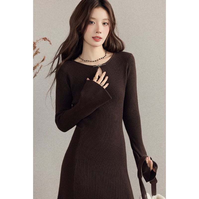 ニットワンピース スリムフィット 細見え ロング丈 インナーワンピ コーヒー色