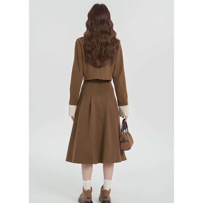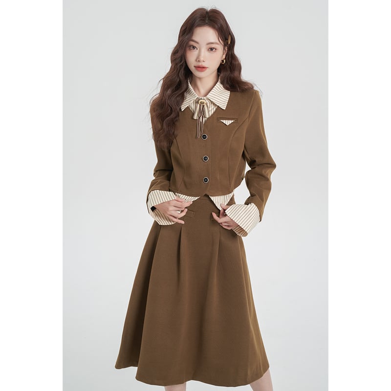 セットアップ トップス+スカート シャツネック ストライプ柄 ブラウン S M L