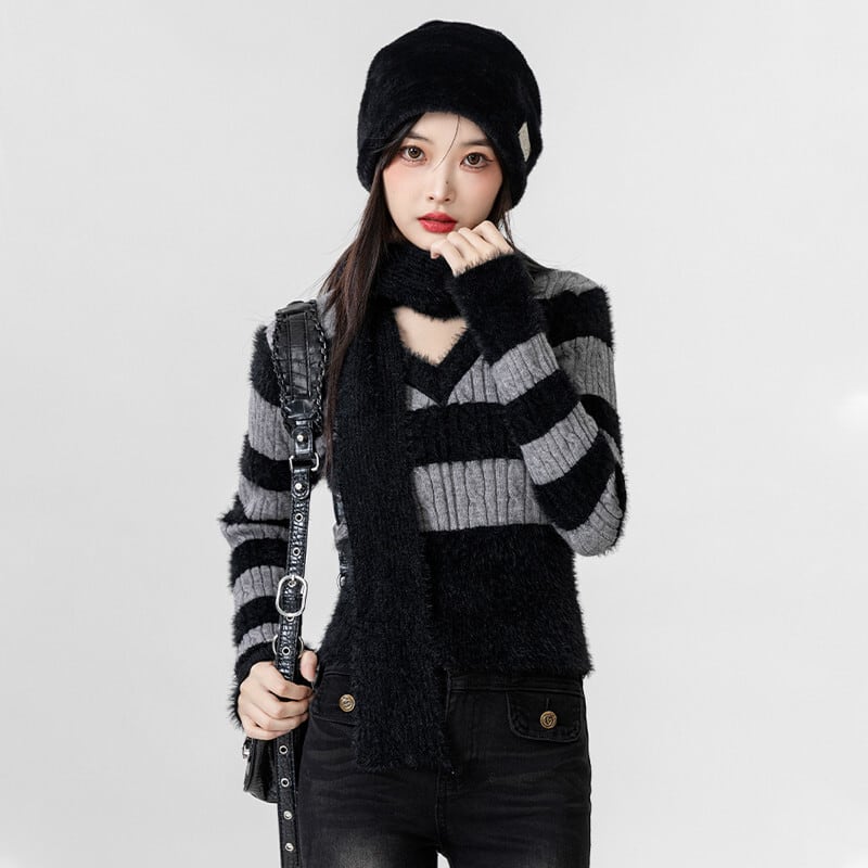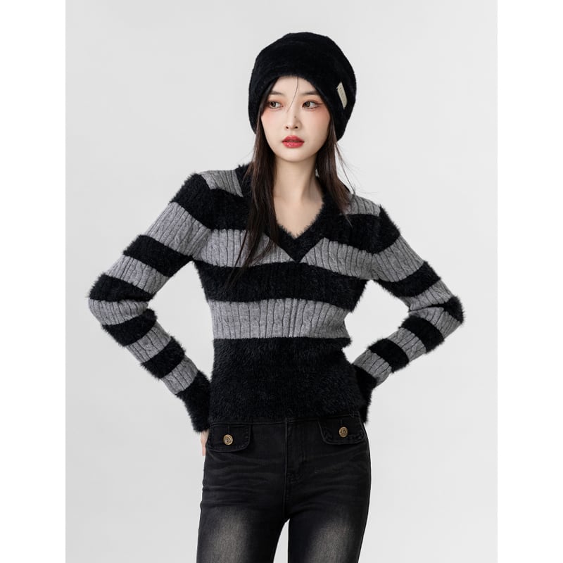 Vネック モヘア 短めシルエット タートル付き ニットセーター