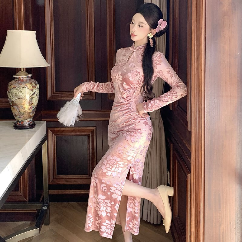 ワンピース チャイナ風 ベルベット 長袖 花柄 ピンク S M L XL