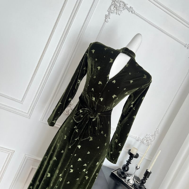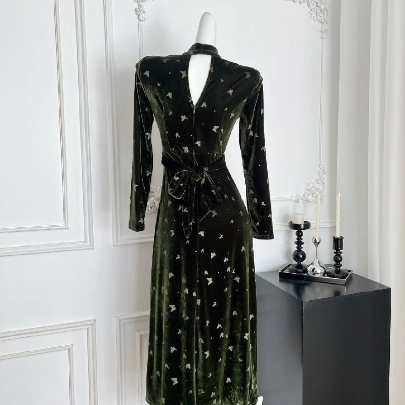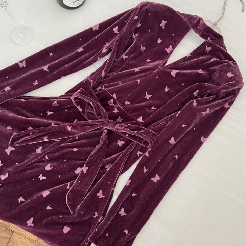 ワンピース ベルベット バタフライプリント 蝶 パープル ダークグリーン S M L