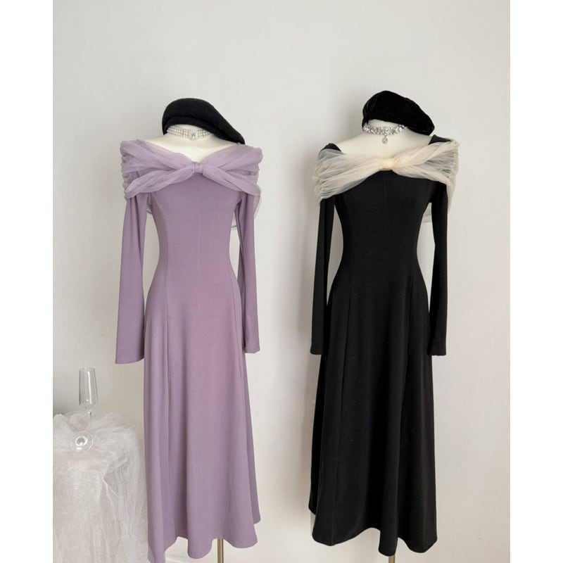 ワンピース 2色展開 メッシュ エレガント 長袖 パープル ブラック S M L