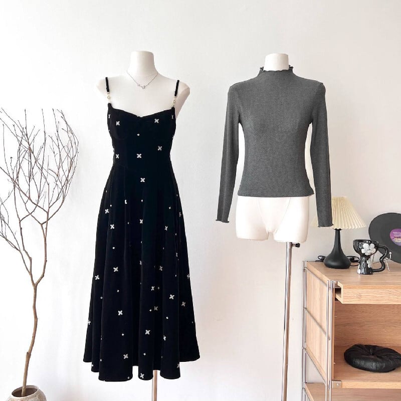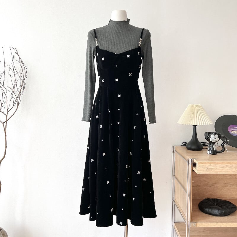 セットアップ グレー インナートップス+ブラック ビロード スリップワンピース S M L