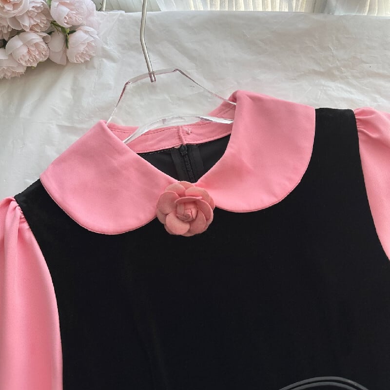 ワンピース ベルベット 配色 ピーターパンカラー ブラック+ピンク S M L