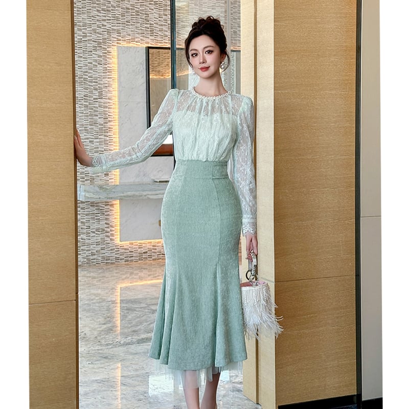 【夕暮薔薇シリーズ】ワンピース レース ウエストイン フィッシュテール ライトグリーン S M L XL